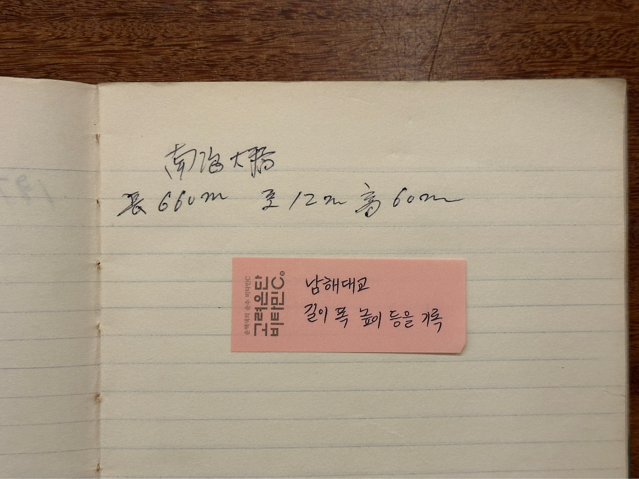 여행을 다녀온 뒤, 할아버지는 남해대교의 길이와 폭, 높이를 기억해두었다가 노트에 꼼꼼히 적어두셨다. 흑백 사진의 여백에는 그날의 날짜를 또박또박 적어 두었다. 지금의 우리에게는 사진 한 장으로 남을 여행을 할아버지는 펜으로 새기고 계셨다.