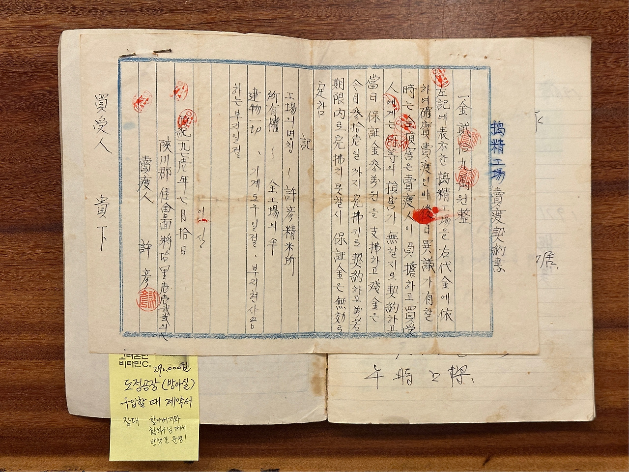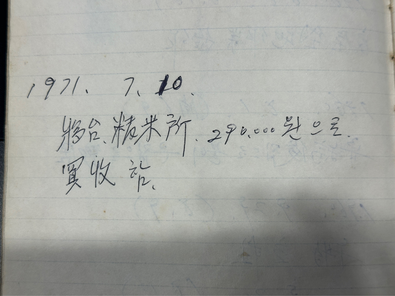 공책을 펼치면 제일 처음 보이는 것이 핀으로 고정해 둔 '도정공장 매도계약서'다. 1971년 여름, 할아버지는 친구분과 함께 외갓집이 있는 동네에서 제법 떨어진 장대리의 정미소를 사셨다. 두 분이서 정미소 겸 방앗간을 제법 오래 운영하셨다고 한다.