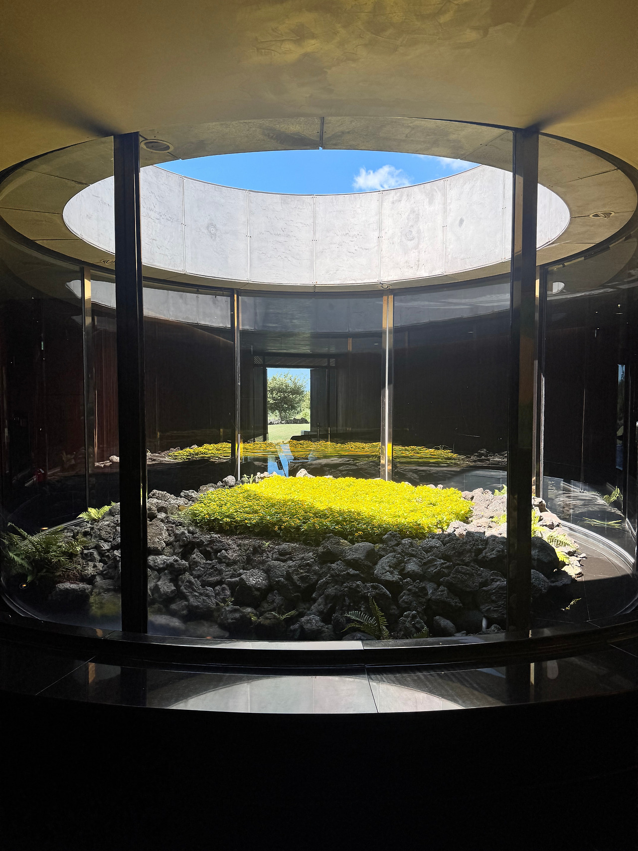 천장이 하늘을 향해 열려 있어, 계절과 시간에 따라 달라지는 빛이 공간의 표정을 만든다.