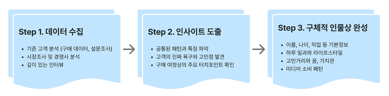 타겟의 나이, 성별, 직업, 라이프스타일, 고민, 가치관 같은 요소들을 이미지와 텍스트로 구현해 브랜드를 운영하는 사람들이 함께 상상할 수 있게 한다.
