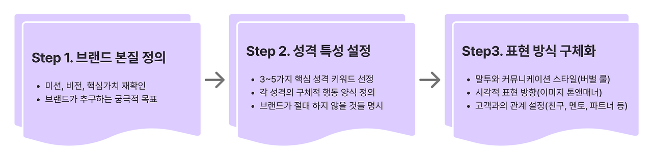 브랜드 페르소나는 브랜드의 태도를 구조화하고, 언어와 행동으로 구현하는 것이다. 따라서 브랜드 페르소나는 브랜드 에센스를 정의하는 것에서 시작하며, 브랜드 성격(Personality), 시각적 표현(Visual Tone&Manner), 언어적 표현(Verbal Tone&Manner)으로 표현된다. 고객과 어떤 식으로 관계를 맺을 것인지, 어떤 표현을 주로 사용해야 하고, 어떤 표현을 절대 사용하지 말아야 하는지 등을 명시함으로써 고객에게 브랜드를 하나의 인물로서 인식될 수 있게 한다.