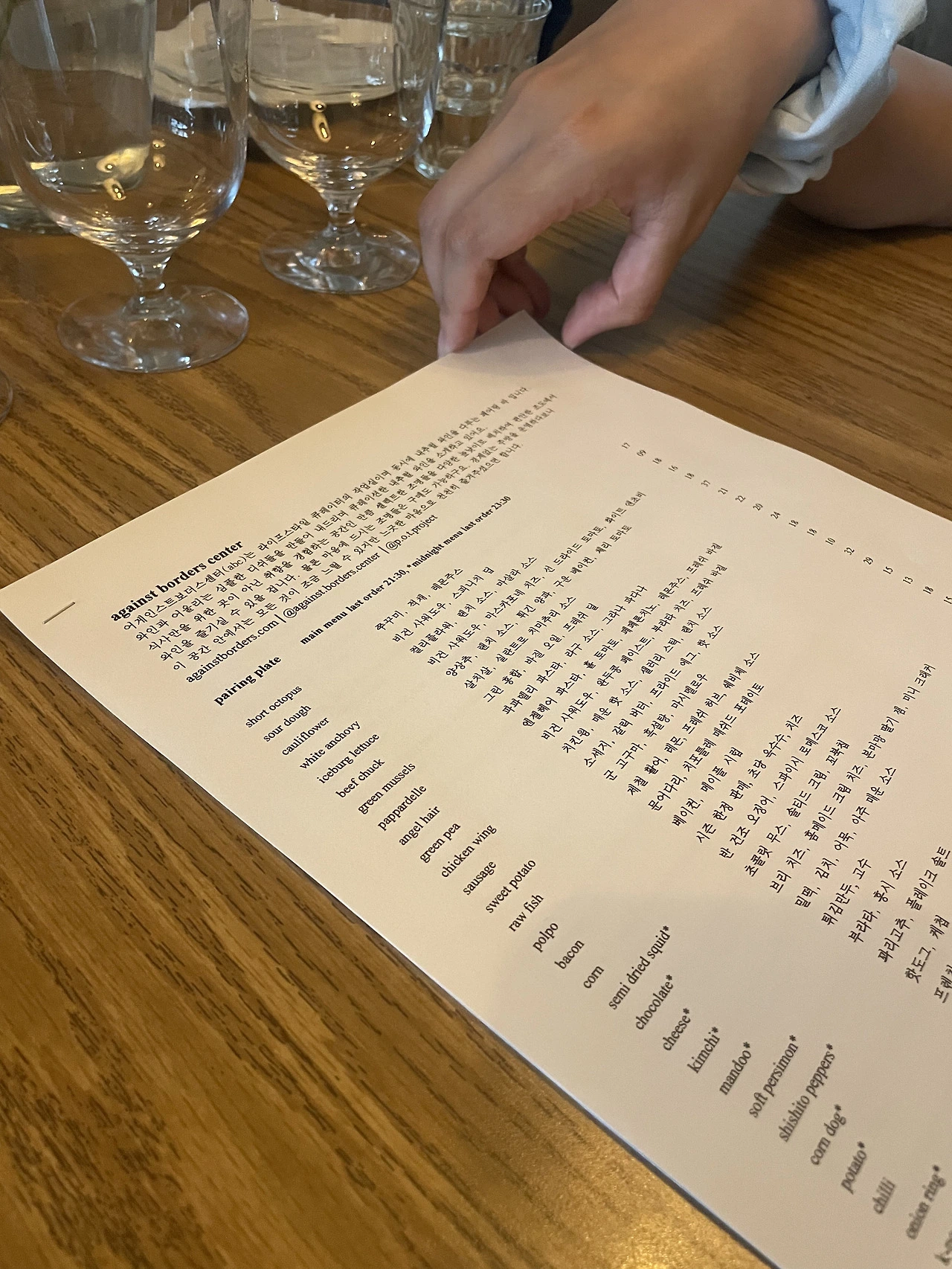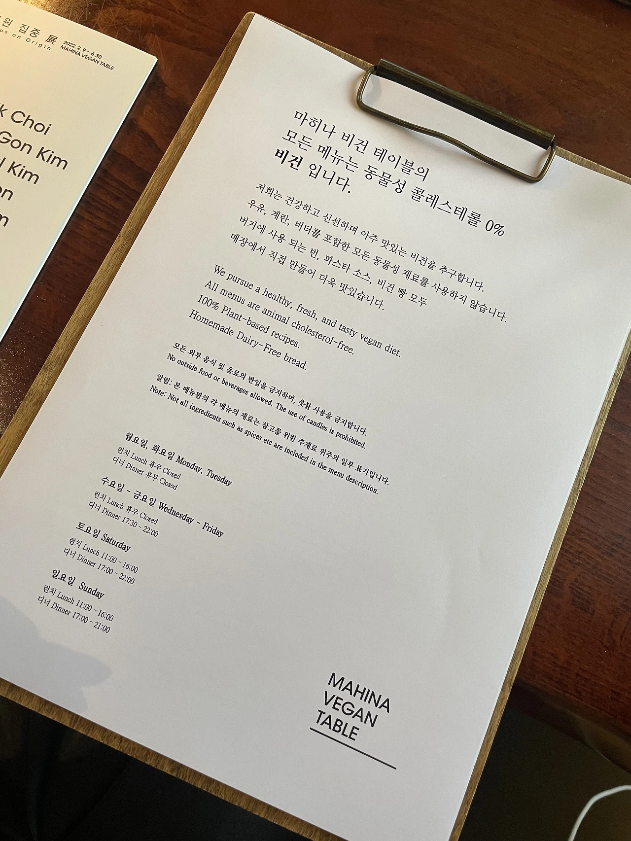 메뉴는 단 5가지. A4 한 장에 여백을 충분히 두고 정갈하게 배치되어 있었다. 각 메뉴마다 간단한 설명과 재료들, 추천 이유가 한 줄씩 적혀 있었고, 계절 메뉴는 따로 작은 카드로 테이블에 세워져 있었다.