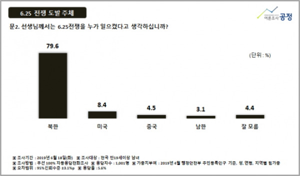 미국이 6.25 전쟁을 일으켰다거나, 중국이 일으켰다고 주장하는 사람들, 잘 모른다고 대답한 성인들이 올해(2019년) 조사에서 17.3%나 된다. 대학 진학률이 OECD 국가 가운데서도 최상위권이고 교육 열하면 알아주는 대한민국 성인의 20% 가까이가 불과 70년 전, 자국이 침략당하고 백수십만 명의 인명피해와 막대한 경제적 손실을 당하고, 수백만 이산가족을 산생시킨 6.25 전쟁의 역사적 사실을 모른다는 것을 무슨 말로 변명할 수 있겠는가?
