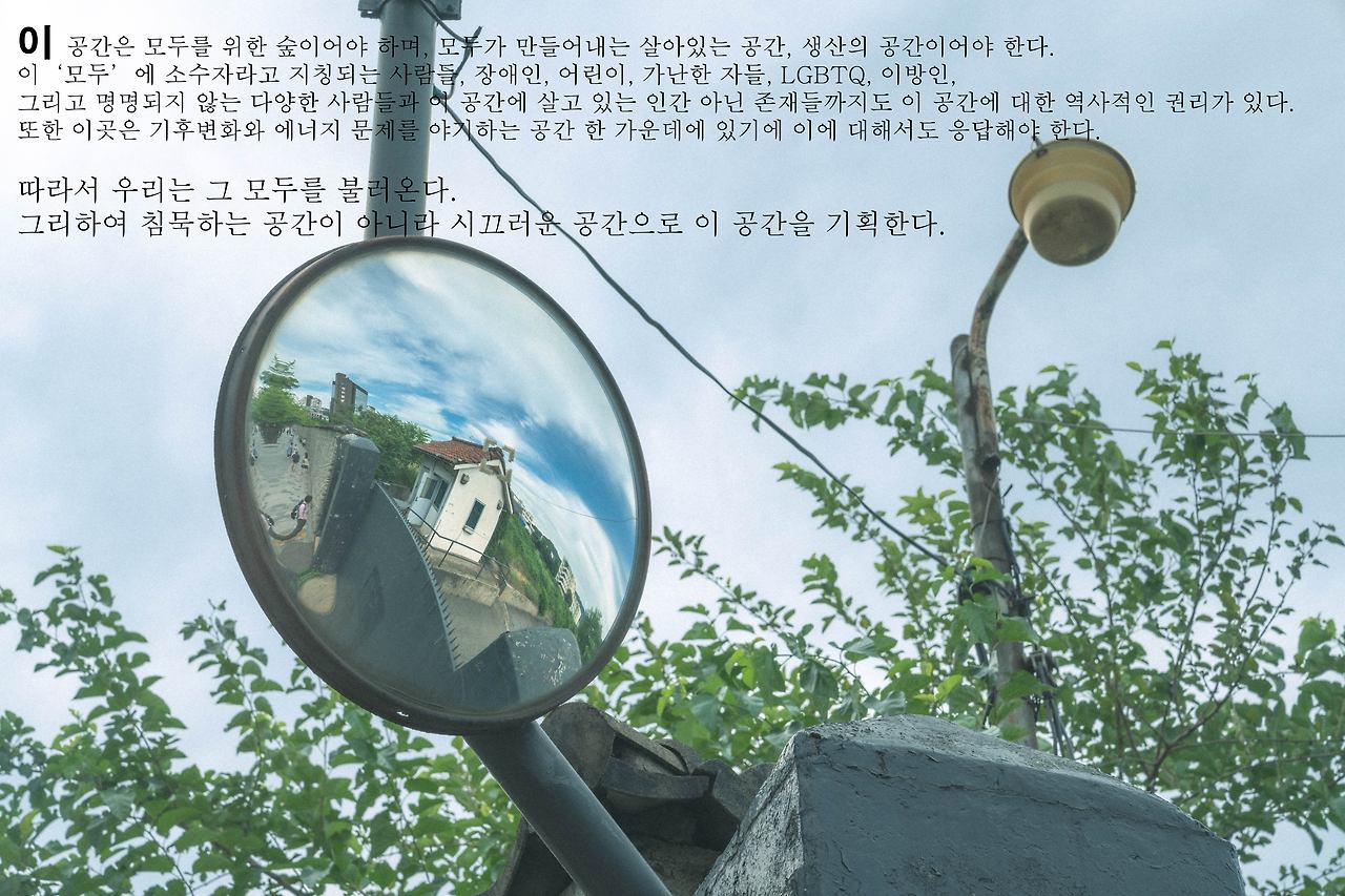 따라서 우리는 그 모두를 불러온다. 그리하여 침묵하는 공간이 아니라 시끄러운 공간으로 이 공간을 기획한다.