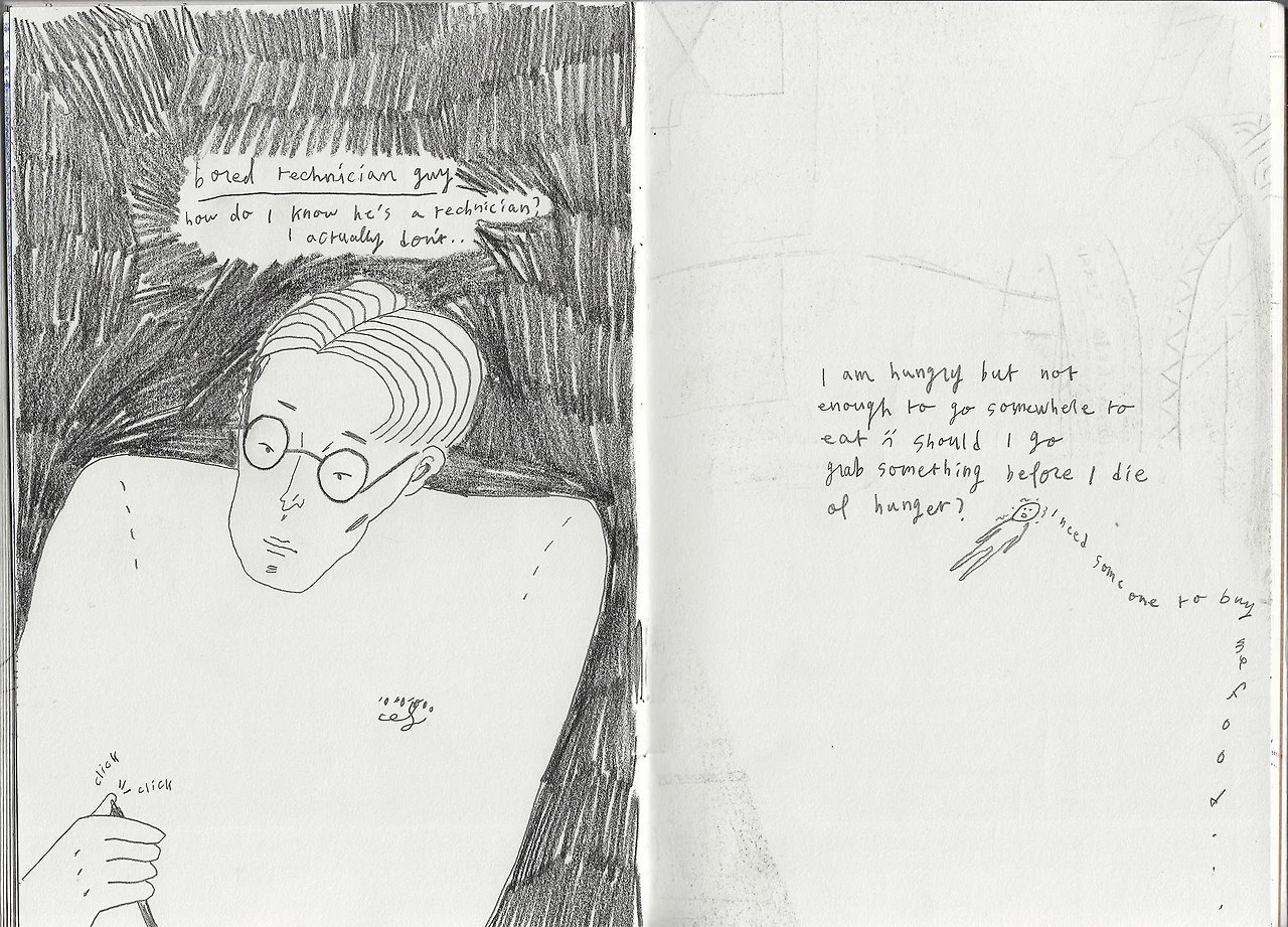 관람객도 없어서 내가 고개만 들면 정면으로 바라볼 수 있었던, 반대편 부스에 앉아 있던 그. 이 날도 누구를 그릴까 두리번거리다 자연스레 앞에 앉은 그를 그리게 됐다. 특정 사람을 힐끔힐끔 쳐다보며 그리다 보면 굉장히 죄를 짓는 듯한 느낌이 든다. 이게 괜찮은 것인지 아닌지 아직까지도 확신이 없다. 그렇다고 상대방에게 직접 다가가 “저기... 제가 당신을 그려도 될까요?” 하고 물어볼 만큼 내 낯짝이 두껍지 못하다. 그래서 이 날도 도둑질하는 마음으로 열심히 그렸다. 재미있는 건 보통 열에 아홉은 본인이 그려지고 있는 것을 알아 챈다. 그들이 모를 거라고 순진하게 믿는 건 나뿐이다. (알면서도 모르는 척해주었던 내 그림 속 사람들의 관용에 감사한다.) 그래서인지, 그와 어느 순간부터 눈이 계속 마주치기 시작했다. 들켰다 라고 생각하고 있는 와중에 그가 자리에서 일어나 내 부스로 걸어오기 시작했다. 어떻게 해야 할지 몰라 그림을 다른 종이 더미 밑으로 스윽 밀어 넣었다. 다행히도 그는 정말 순수히 내 부스를 구경하러 온 것이었고, 그렇게 몇 마디를 나누다 결국에 나는 내가 그를 그리고 있었다고 고백했다. 그렇게 죄를 씻듯 그에게 그림을 보여주었고 다행히 그는 마음에 들어하는 듯했다. 이 날 이후로 우리는 자연스레 인사를 하기 시작했고, 페어가 끝날 때쯤에 그는 현지씨가 되어 있었다.