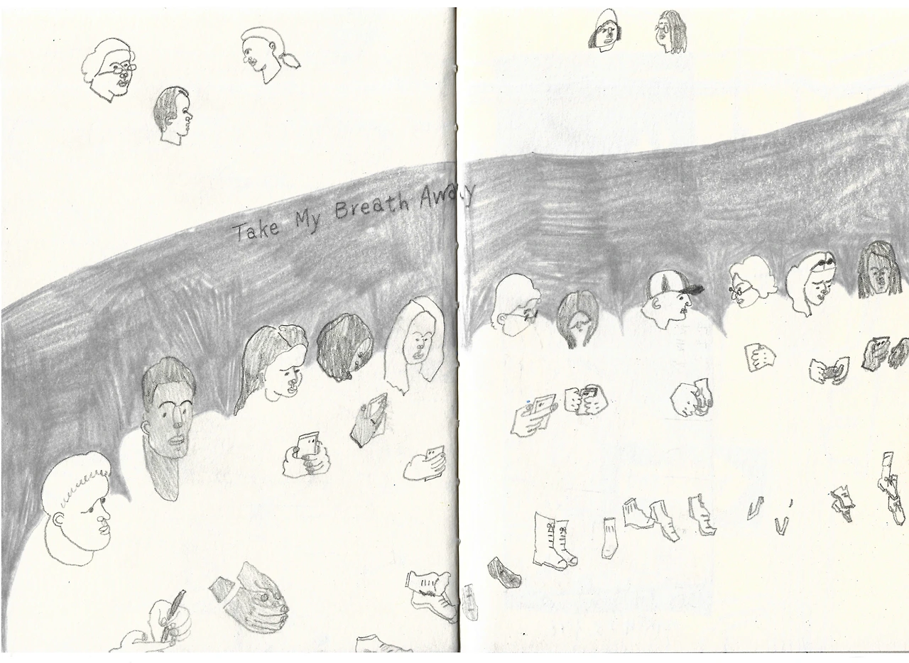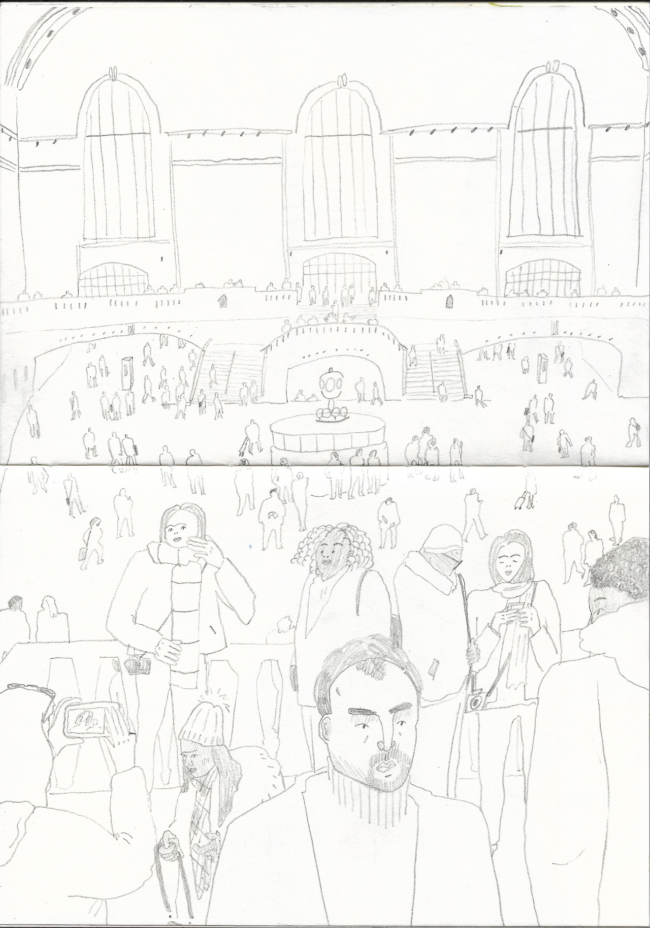 이건 (아직) 어디에도 게시하지 않은 스케치. 뉴욕에 있을 때 친구들과 함께 그랜드 센트럴 터미널을 방문했다. 역에 들어서자마자 그 웅장한 크기에 압도당했다. 시간만 더 있었다면 당장 계단에 앉아 그림을 그릴 수 있었을 텐데, 아쉽게 우리는 시간이 얼마 없었다. 구글 포토를 뒤적이며 발견한 당시의 사진이 그러한 아쉬움을 불러일으켜줬다. 워밍업 정도로 시작한 그림인데, 생각보다 원근법이나 공간감각을 필요로 해서 완성하는데 시간이 꽤 걸렸다. 이 그림 또한 타블로의 팟캐스트를 들으며 그렸다. 재미있는 것은 그림의 부분 부분을 볼 때마다 내가 어떤 이야기를 들으며 그렸는지 기억난다. 저 뒤에 계단을 그리고 있을 때는 타블로가 명품 옷 소비에 대한 이야기를 하고 있었더랬지. 그림 그릴 때 너무 많은 생각을 하는 것을 좋아하지 않는데, 나의 집중력을 생산적으로 분산시켜주는 게 바로 팟캐스트다.