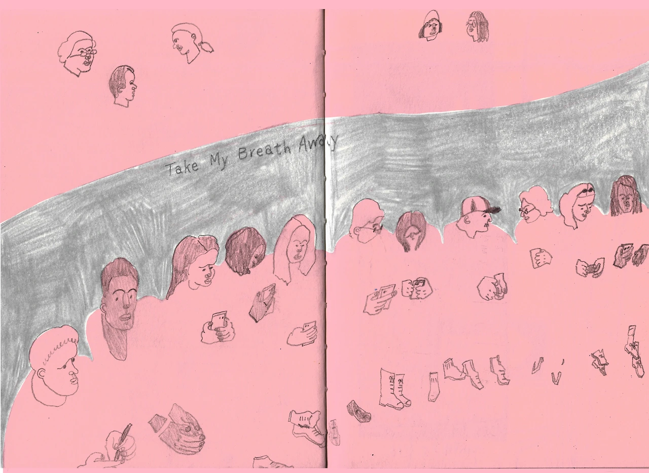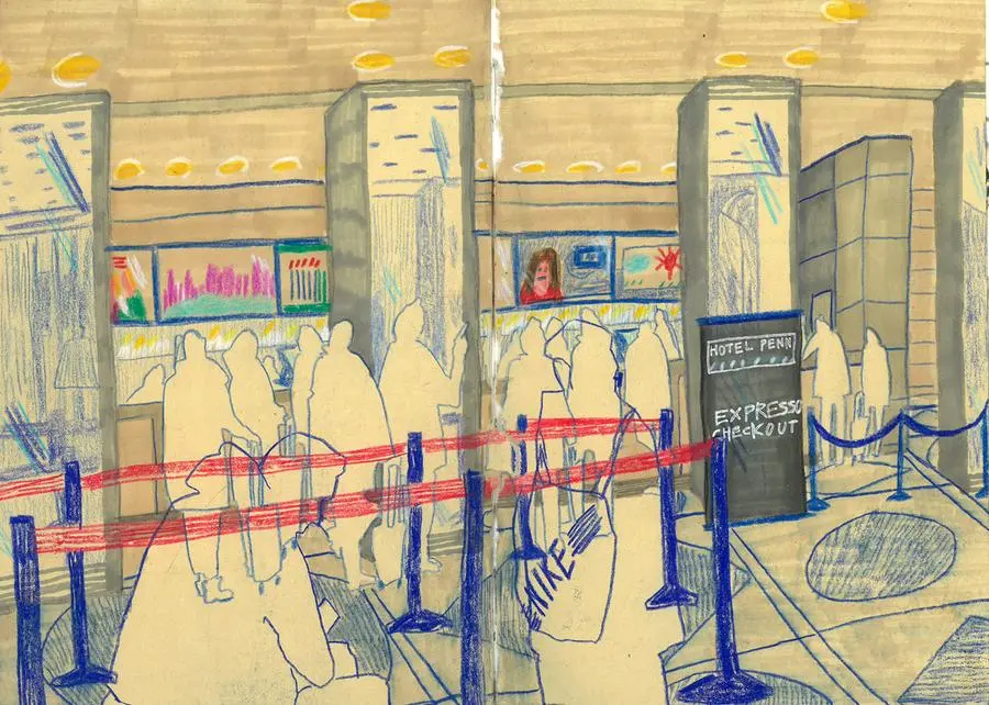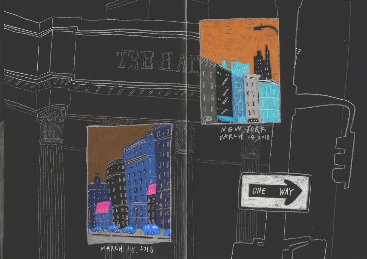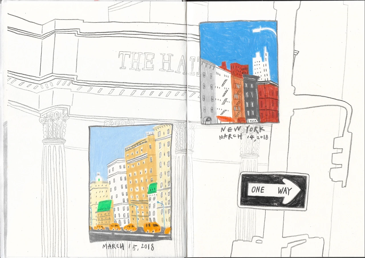 뉴욕을 떠나는 마지막 날, 호텔 리셉션에서 교수들을 기다리며 그린 그림이다. 밖에는 비가 내리고 있어서 오후임에도 불구하고 하늘이 깜깜했다. 호텔 투숙객들로 보이는 사람들은 제대로 된 우산 하나 없는지 모두 비에 젖어 있었다. 그런 사람들을 흘끔흘끔 쳐다보며 그렸다. 후에 런던으로 돌아오고 나서 그림을 인스타그램에 올렸는데, 호텔 측에서 메시지가 왔다. 아직도 호텔에서 묵냐고 물어보더니 다음에 올 때 꼭 알려달라고 했다. 다음에 오면 무엇을 해주려고 그랬나 궁금하나 호텔이 흡사 영화 샤이닝에 나오는 호텔과 비슷했기에 다시 찾아갈 일은 없을 것 같다.