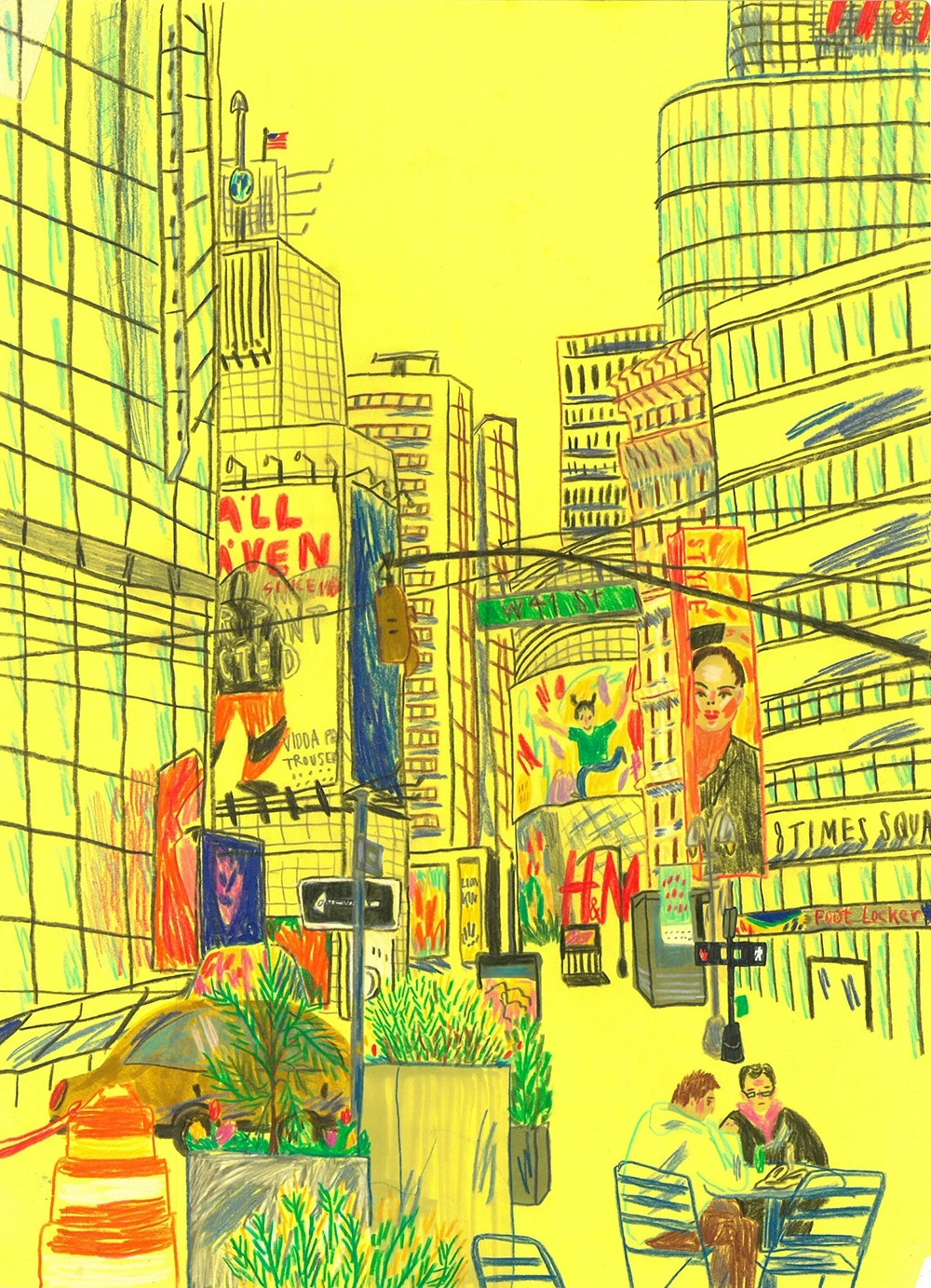 학교 친구와 함께 “우리가 뉴욕에 왔는데 타임스퀘어를 안 그리면 섭섭하지!” 해서 둘이 쫄랑쫄랑 타임스퀘어로 갔다. 이 날은 St. Patrick’s Day 였고, 거리의 행인들은 모두 초록색 옷을 입고 이 날을 즐기고 있었다. 덕분에 타임스퀘어로 가는 길이 사람들을 구경하느라 굉장히 짧게 느껴졌다. 대충 앉을자리를 보고 털썩 앉아서 시간 가는 줄 모르고 그림을 그리기 시작했다. 언제나 그렇듯, 지나가던 몇몇 사람들이 호기심에 우리를 슬쩍 보는가 하면 어떤 사람들은 직접 다가와 말도 걸기도 했다. 그림에서는 타임스퀘어가 나름 산뜻해 보이지만, 현실은 굉장히 춥고 바람도 많이 불었다. 그림을 마무리할 때쯤에는 손가락이 얼어서 감각이 없더라. 그래도 후회 없는 시간과 결과물이었다. 나는 그림을 그리고 나서 무조건 이름을 짓는데 — 뭔가 ‘진짜’ 마무리를 하는 느낌으로 — 이 그림은 Busy Time Square 라고 이름을 붙여줬다. 하지만 이 그림도 보면 볼수록 ‘내가 왜 사람을 더 그려 넣지 않았을까?’ 하는 생각이 든다. 아마 이 당시에 사람 그리는 것에 자신이 없어서 그랬던 것 같기도 하다. 그나마 그려 넣은 남자 두 명도 잘 보면 참 자신 없는 게 느껴진다. 그에 비해 하늘 높게 솟은 마천루들을 그리는 건 너무 즐거웠다. 그 많은 창문과 간판, 브랜드 로고 그리고 입구를 다 그려 넣으면 내가 마치 건축가가 된 기분이었다. 다음에 타임스퀘어를 또 그리게 된다면 건물뿐만 아니라 사람들도 조화롭게 그려보고 싶다.