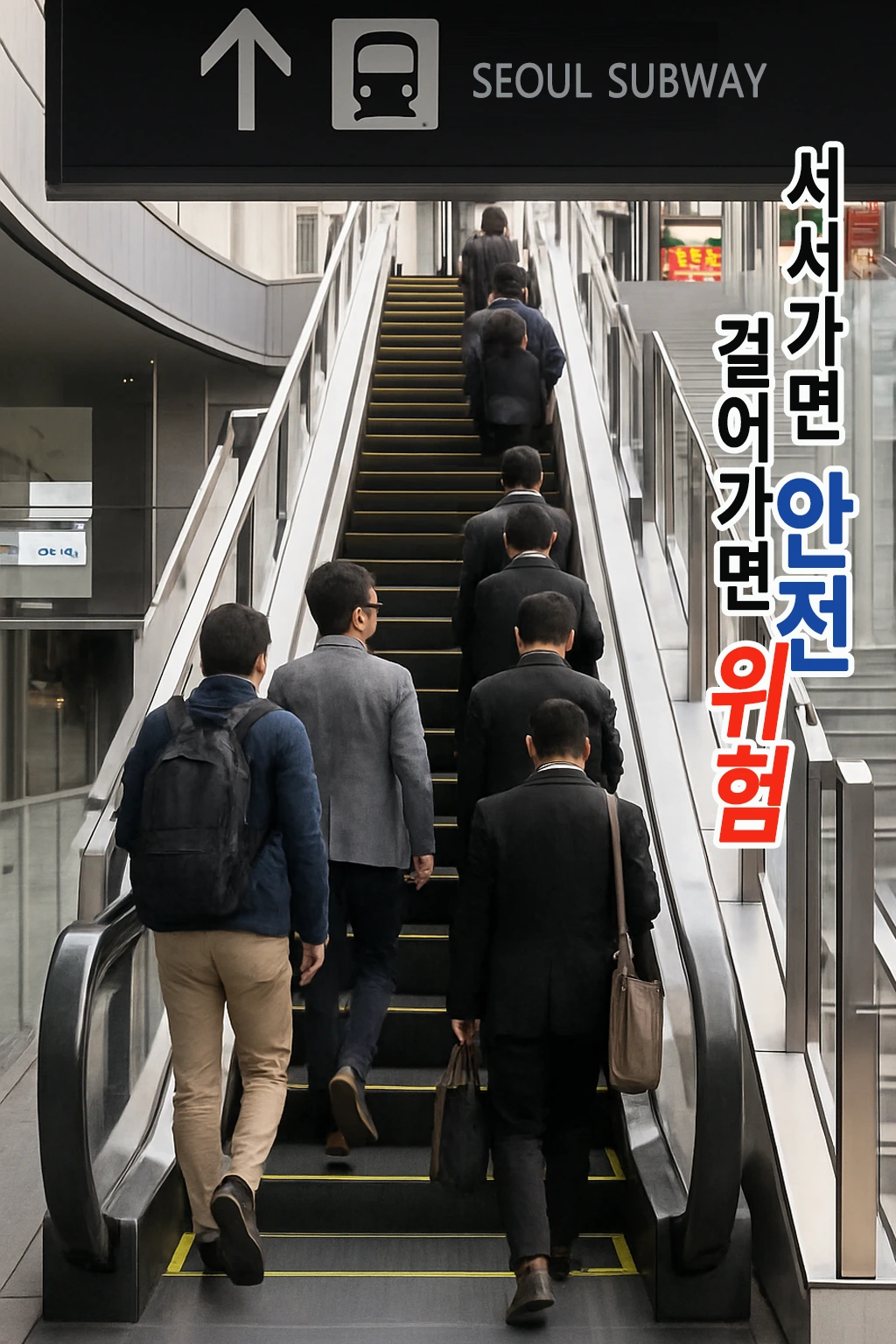 정작 에스컬레이터에서는 걷거나 뛰지 않는 것이, 원래의 정석은 두 줄로 서서 손잡이를 잡는 것이 전 세계적 안전원칙이다.
