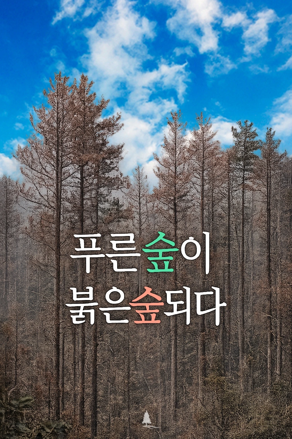 푸른 숲 사이에 서 있는 갈색의 나무들은