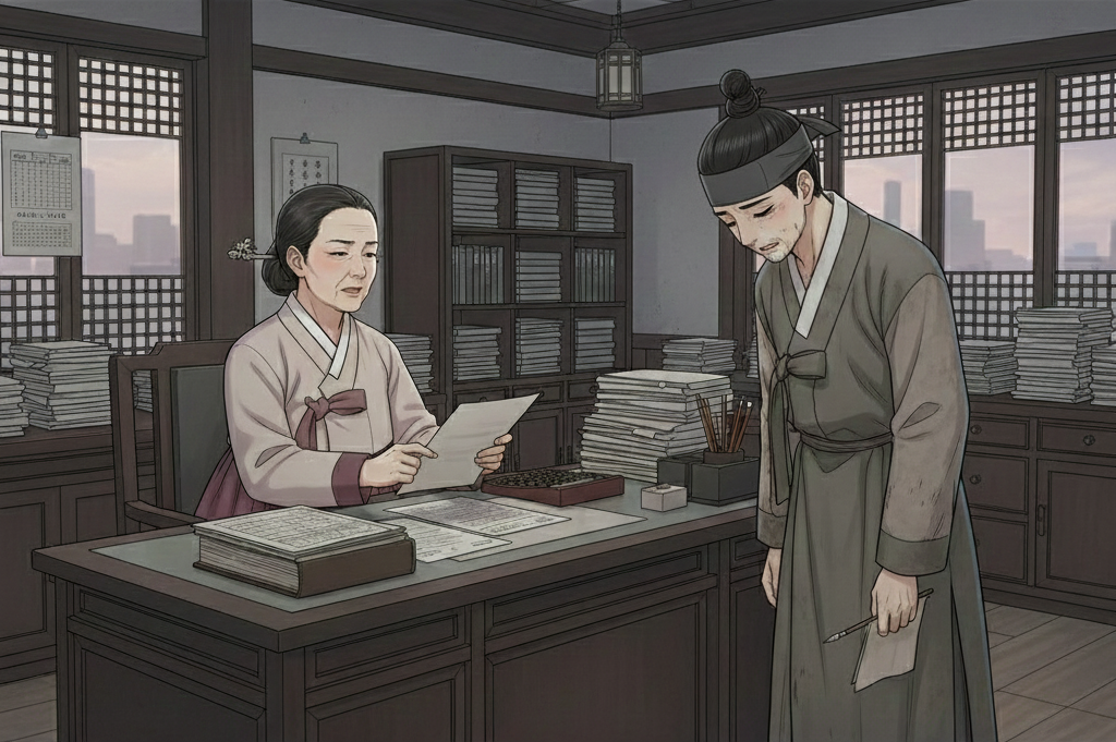 박 서기는 유 씨 마님 밑에서 상단의 모든 회계를 처리하는 실무자였습니다. 그는 유 씨 마님의 독선적인 성격을 알면서도, 자신의 뛰어난 능력에 대한 주변의 인정과 상단의 안정적인 지위를 잃을까 두려워 관계를 끊지 못했습니다. 그는 끊임없이 유 씨 마님에게 착취당하고 고통받았지만 스스로 무기력함을 택하며 굴종하는 관계에 집착했습니다. 더 나아가, 유 씨 마님의 비인간적인 명령(채무자에게 가혹한 이자를 부과하는 등)을 집행하며 업(카르마)을 공유했습니다. 이는 현생에서 거친 남자들과의 인연이 닿고 관계를 끊어내지 못하는 집착의 씨앗이 되었습니다.