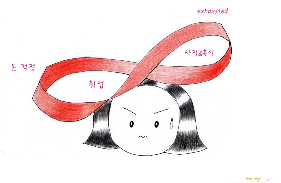 돈 걱정 → 취업 → 에너지 고갈 → 사직, 휴식 → 미래에 대한 걱정 → 당장의 돈 걱정 → 취업...