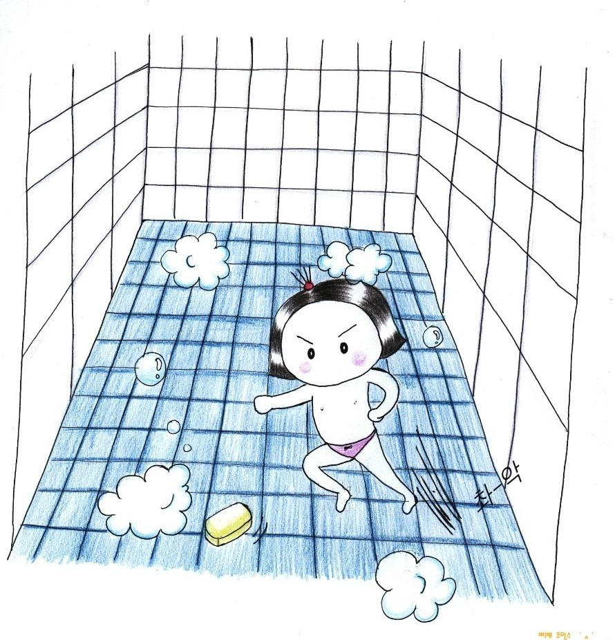 화장실 타일 바닥 전체를 비누로 빡빡 문질러