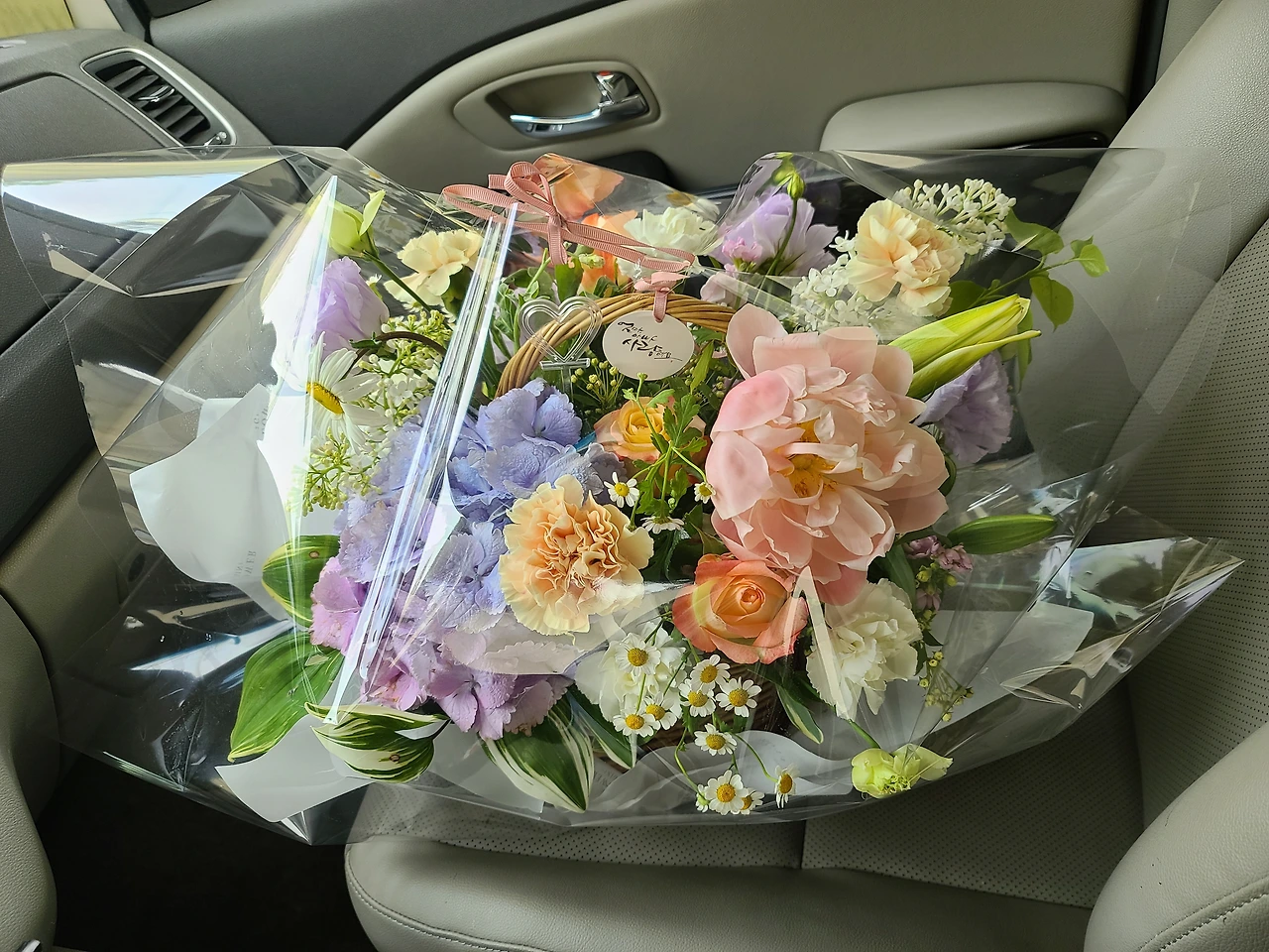 조금 전에 찾아온 꽃바구니를 가져다 드릴 생각이다