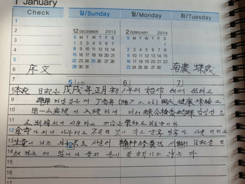 본기 일기는 무술년 정월초부터 시작해서 쓰려고 준비하였는데 정유년(양 7.2.26) 국민건강보험공단 일산병원에 입원하여 여러 종합검사에서 갑상선으로 판명되어 시술하고 지금은 약물로 치료 중이다.