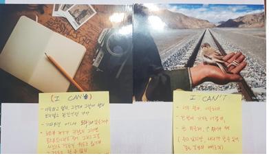 1) 진열된 사진들 중 내면의 대화 사진을 두 장 고른다. 한 장은 “I Can(시도해 봐).”이고 다른 한 장은 “I Can't(난 할 수 없어. 하지 말자)”라는 메시지를 주는 사진을 선택한다.