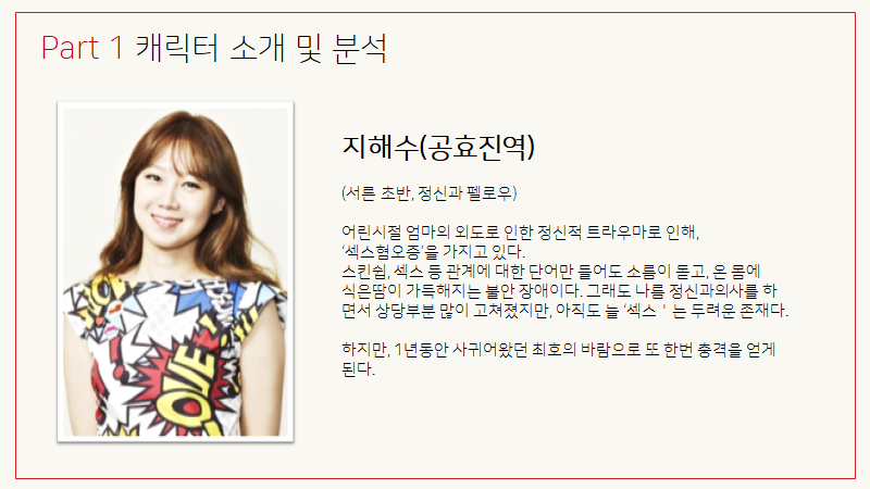 여주인공 지해수(공효진)의 캐릭터가 나는 너무나 인간적이고, 매력적이고 통통 튄다고 생각했다. 마음의 병을 치료하는 정신과의사, 말로만 들으면 정신과 의사는 우리에게 마치 ‘마음의 병’으로부터 완전히 해방되어 있고, 관계 속에서도 상처받지 않는 온전한 사람일 것이라는 착각을 불러일으킨다. 왜? 의사니까! 그것도 마음의 병을 치료할 수 있는. 하지만, 지해수는 그러한 착각을 완전히 깨트리는 인물이기도 한 점이 마음에 들었다. 본인 역시 엄마가 바람 피는 장면을 목격하는 그 순간부터 발생된 트라우마(섹스, 관계에 대한 불안증과 공포) 로부터 벗어나지 못하는 한 개인 이었기 때문이다.