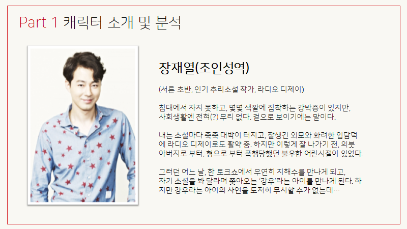 남자 주인공인 장재열 역시 마찬가지다. 키도 훤칠하고, 젊고, 잘생기고, 돈 많고, 밝고 긍정적이며, 심지어 자신의 친구와 애인이 배신하는 그 순간까지도 쿨하게 떨쳐버리는 모습은, 거의 ‘완벽’에 가까운 모습의 사람이다. 그러나 그 역시 의붓아버지의 폭행으로부터 늘 도망치다가 생긴, ‘화장실’이외에는 잘 수 없는 다소 충격적인 모습부터, 빨강, 노랑, 파랑, 검정, 흰색 등 색깔과 깨끗함에 대한 강박은 물론 결국에는 환시를 보는 ‘정신분열증’까지 앓고 있는 캐릭터다. 언뜻 보면 완벽해 보이는 이 캐릭터에도, 수많은 단점들과 아픔들 그리고 상처가 내재해 있다.