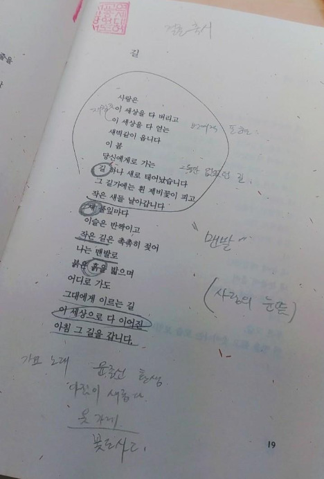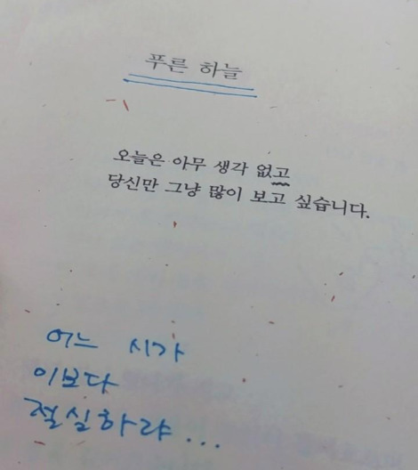 그렇지, ‘시’라는 게 마냥 어려운 것이 아니지. 그저 모르겠어도, 그 모르는 감정을 가져가는 것, 또 그저 어느 시어를 보고 느낀 감정이 있다면 그것을 모두 가져가는 것이 시를 읽는 일일 텐데… 나는 그 파란 수성 사인펜의 주인과 어느 정도 마음이 통했다. 어느 누구인지 모르는 분이지만 꼭 같이 읽은 것 같은 느낌, 묘했다.