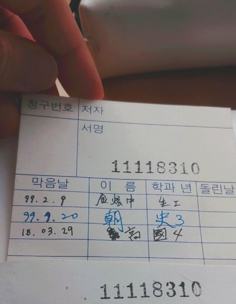 그리고 그 파란 수성 사인펜의 주인의 감정들이 인상 깊었다. 마구 느끼고 마구 표현하고 있는 기분이었다. 나도 그 ‘도서 열람표’에 슬그머니 이름을 적어보았다. 적혀있는 이름들이 다 한문이라서 이어서 한문으로 쓰려다가 망해버렸다. 그래도 정말 기억에 남는 순간이 될 것 같다. 언제 내가 20년 전의 선배가 느낀 감상을 실시간으로 들어보겠는가. 내 또래였을 그의 청춘을 만나볼 수 있었을까. 역시 종이에 적힌 것들은 오래 남는다.