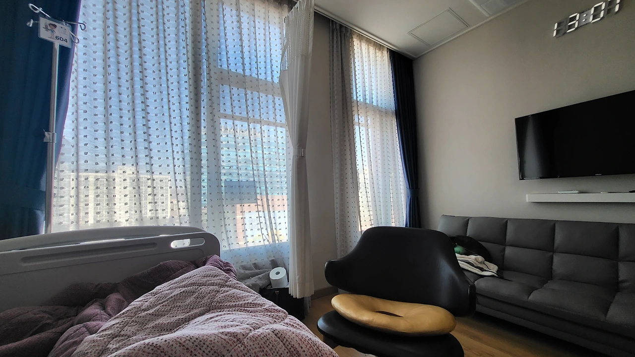 정말 다행스럽게도 2일 차부터는 1인실에 자리가 나서 바로 옮겼고 소변줄도 빼고 컨디션도 훨씬 좋아졌다. 창도 크고 보호자 자리도 편하게 나와서 남편도 병실에서 편히 자게 할 수 있어서 맘이 덜 불편했다.
