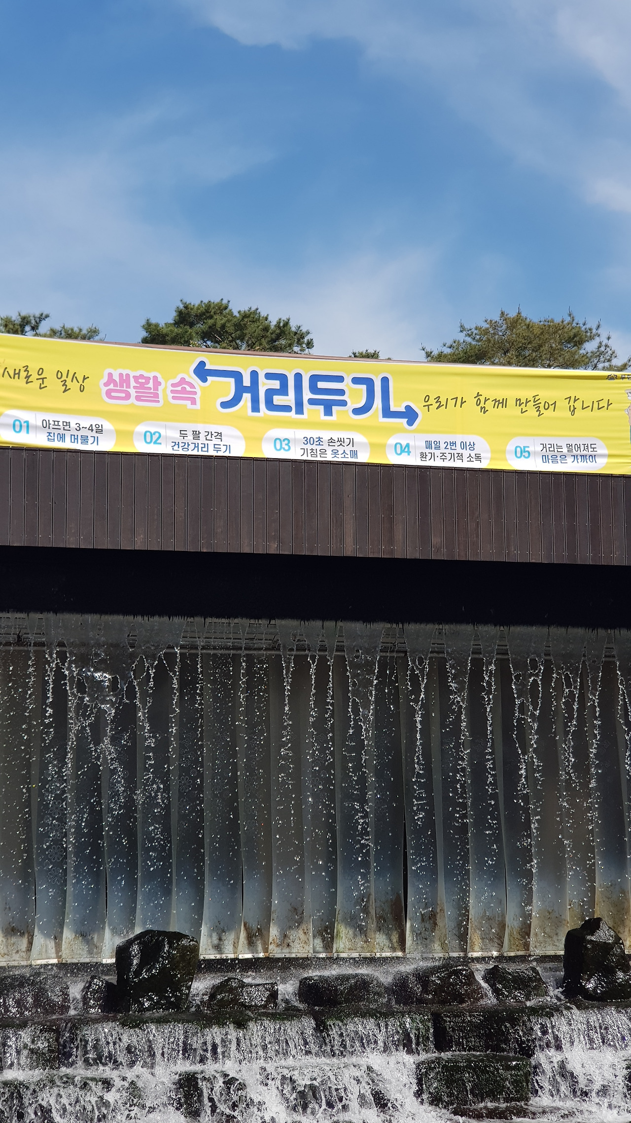 심곡천 산책로는 걷고 있는 몇 사람과 아이들 손을 잡고 나온 몇몇이 가끔 지나다닐 뿐 한산했다. 마주 오는 사람이 있으면 알아서 거리를 유지하려 노력하며 나도 심곡천을 따라 끝까지 걸었다. 심곡천 끝에 다다르자 인공으로 만든 폭포 위에 노란색 현수막이 보인다.