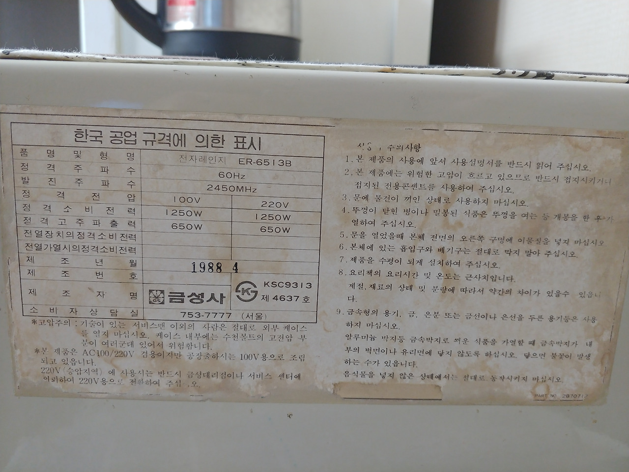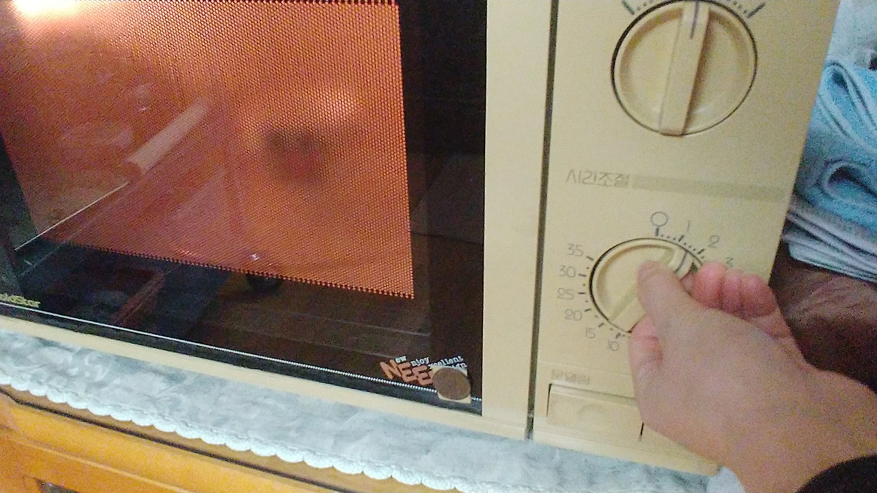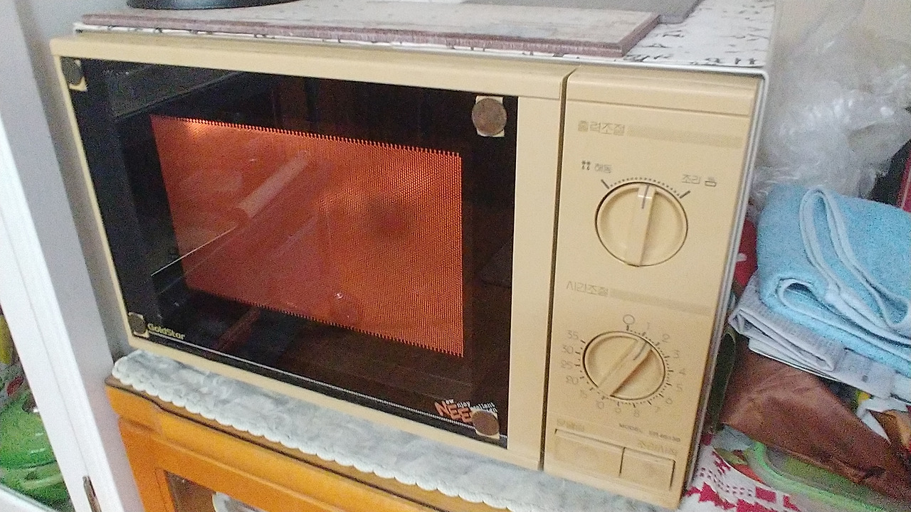 저거(전자레인지)를 사고 나서 처음으로 돌렸을 때, 친척들이 집에 다 와 있었거든. 모두가 다 저게 돌아가는 걸 숨죽이고 지켜봤지. 근데 윙~ 하고 돌아가다가