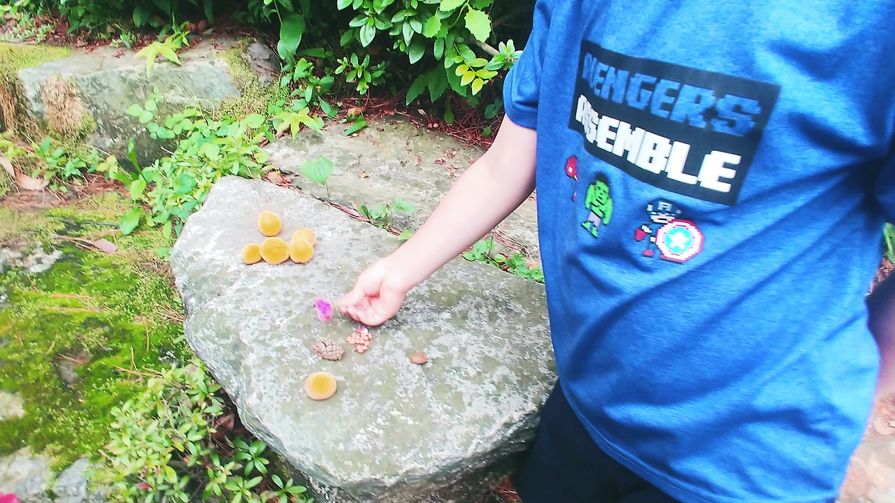 그리고 그 옆에 이제 막 열리기 시작한 장미 꽃잎과 솔방울까지 따서 다람쥐 식구들을 위한 한 상이 근사하게 완성되었다. 자연을 따다 데코레이션 하는 어린이들의 플레이팅 실력에 심쿵-한 여름이었다.