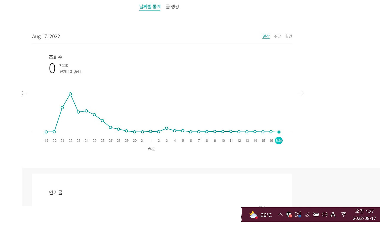 그런데 오늘 밤은 불현듯, 이 현상이 너무 궁금한 거야. 그래서 바로 '통계'메뉴로 가서 그 시간 조회수를 클릭해 봤지. 그랬더니 조회수가 몇이었게??