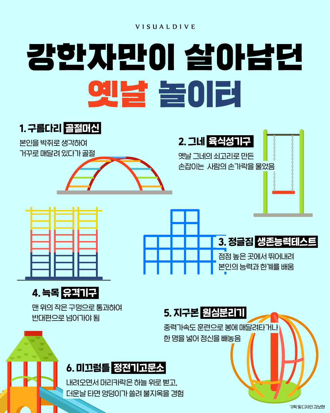 지금 시대의 엄마적 관점으로 보면 옛날 놀이터는 참으로 위험천만한 곳이었다. 아이들의 시선에는 정말 신나게 놀 수 있는 놀이기구임에는 분명하지만 위험한 건 위험하다. '강한 자만이 살아남던 놀이터'라는 글을 보았을 때 인터넷상에서는 모두들 웃으며 옛날을 추억했겠지만 나는 웃지 못했다.