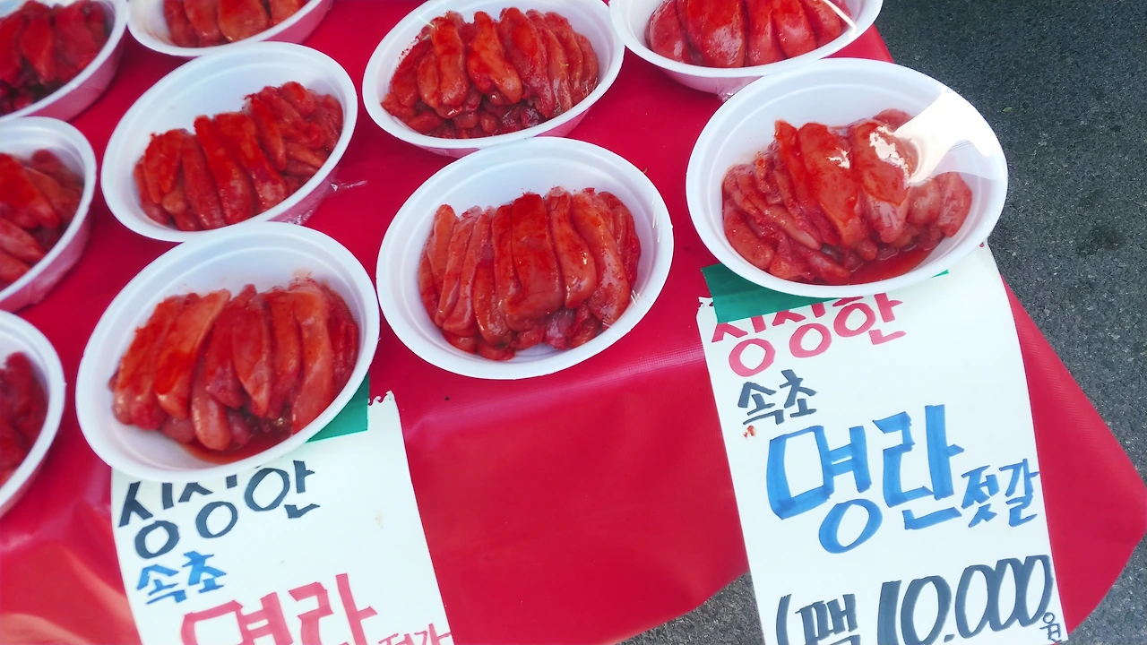 한 바구니에 만원 하는 명란젓! 명란젓은 꼭 항구에 가서 신선한 것으로 사 오던 내가 흔들리던 순간이었다. 너무 저렴한 가격에 못 이겨 명란을 가득 사와 참기름 휘휘 둘러 뜨신 밥에 척 올려 먹는 행복. 명란젓도 장바구니에 담아본다.