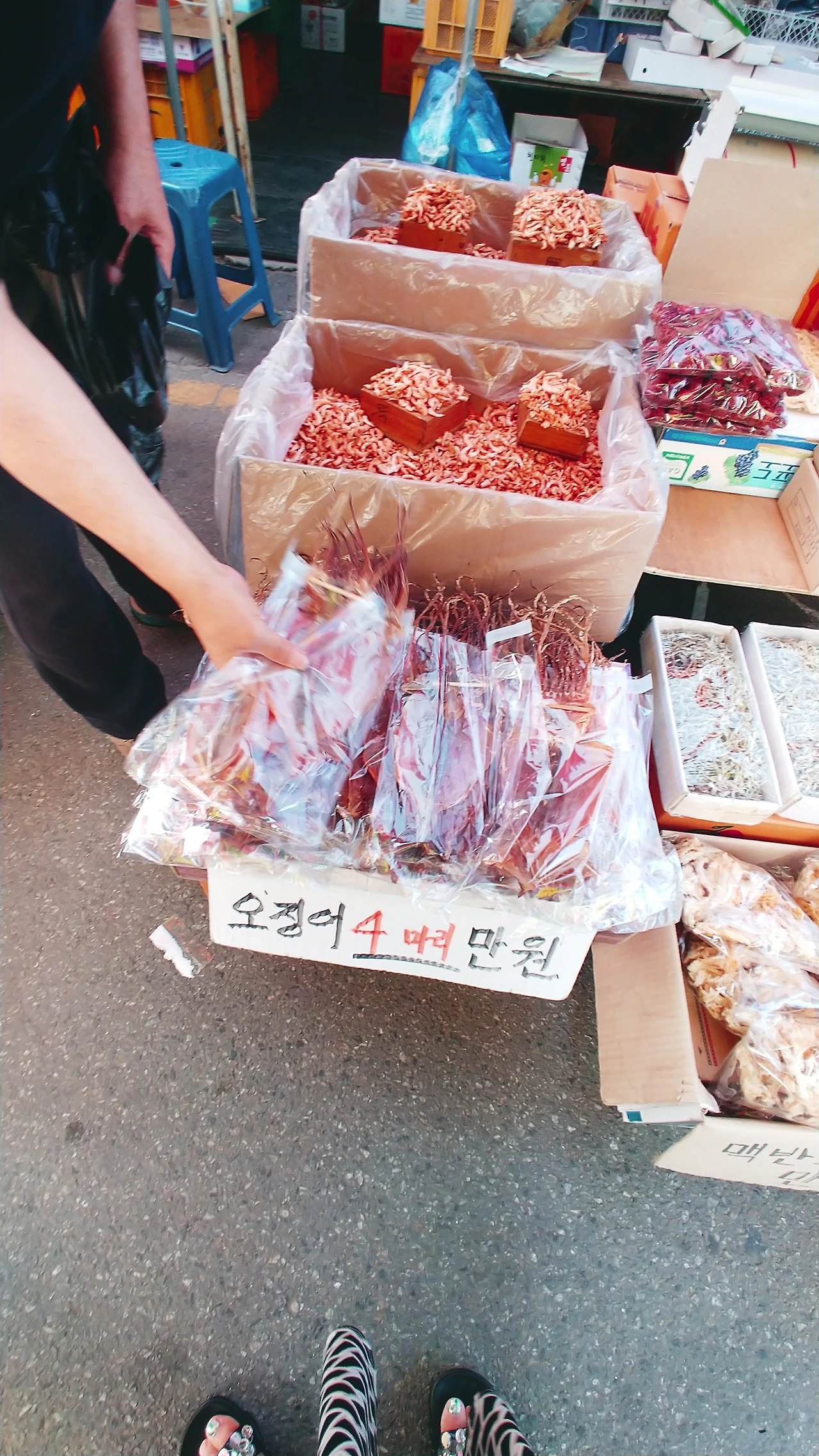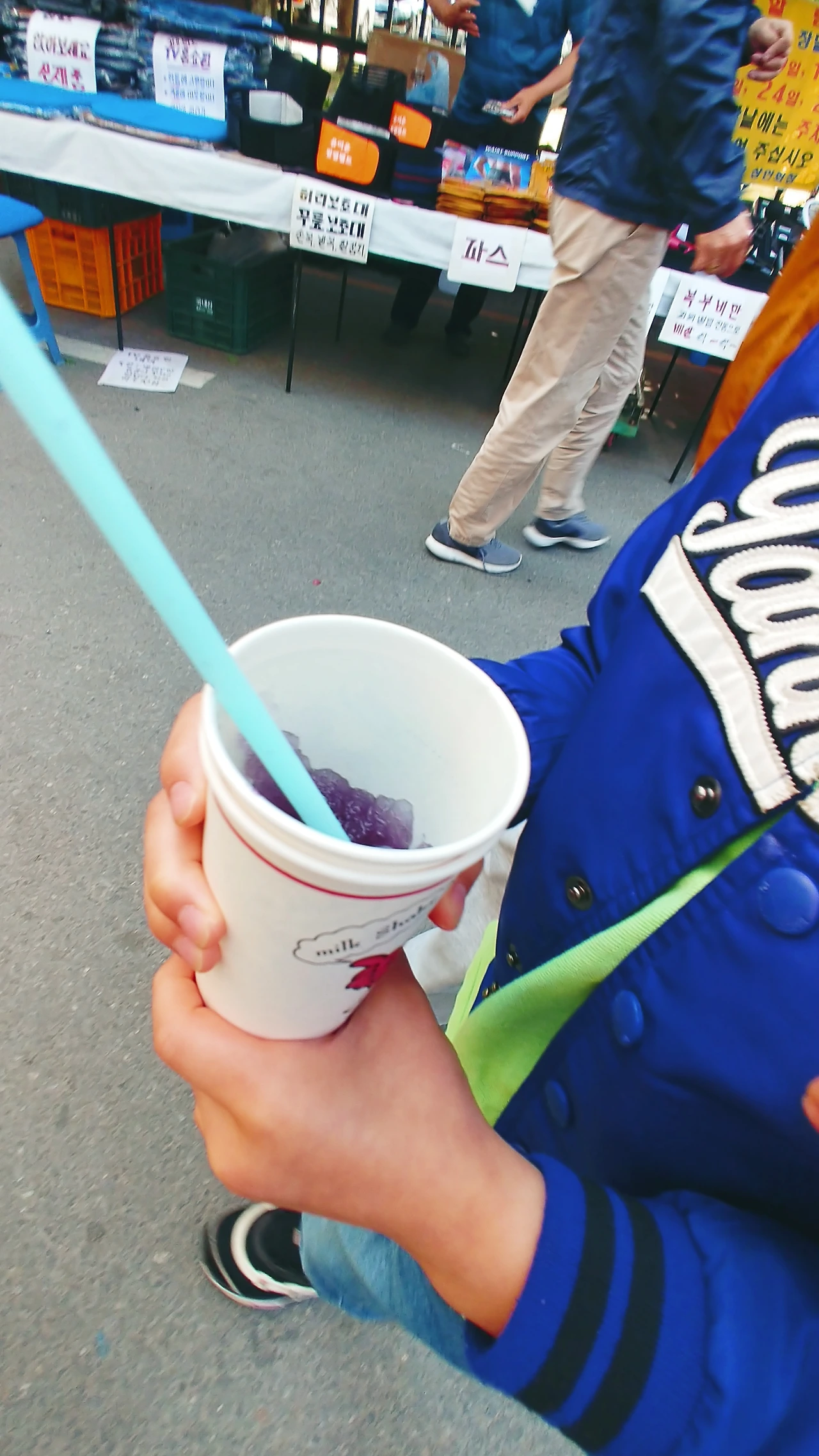 내가 오징어와 반찬거리를 사는 동안 우리 집 꼬맹이는 아빠로부터 슬러쉬 한잔을 득템하고 있었다. 머리 띵-하게 만드는 포도맛 슬러쉬- 우리 아이도 이렇게 장에 대한 추억을 쌓아가겠지. 내가 어린 시절 그랬던 것처럼.