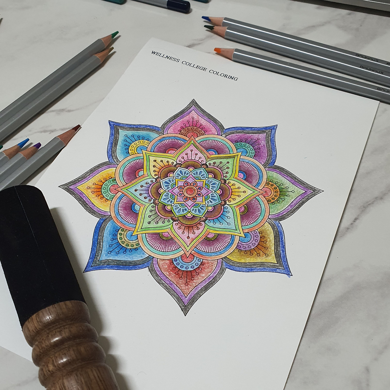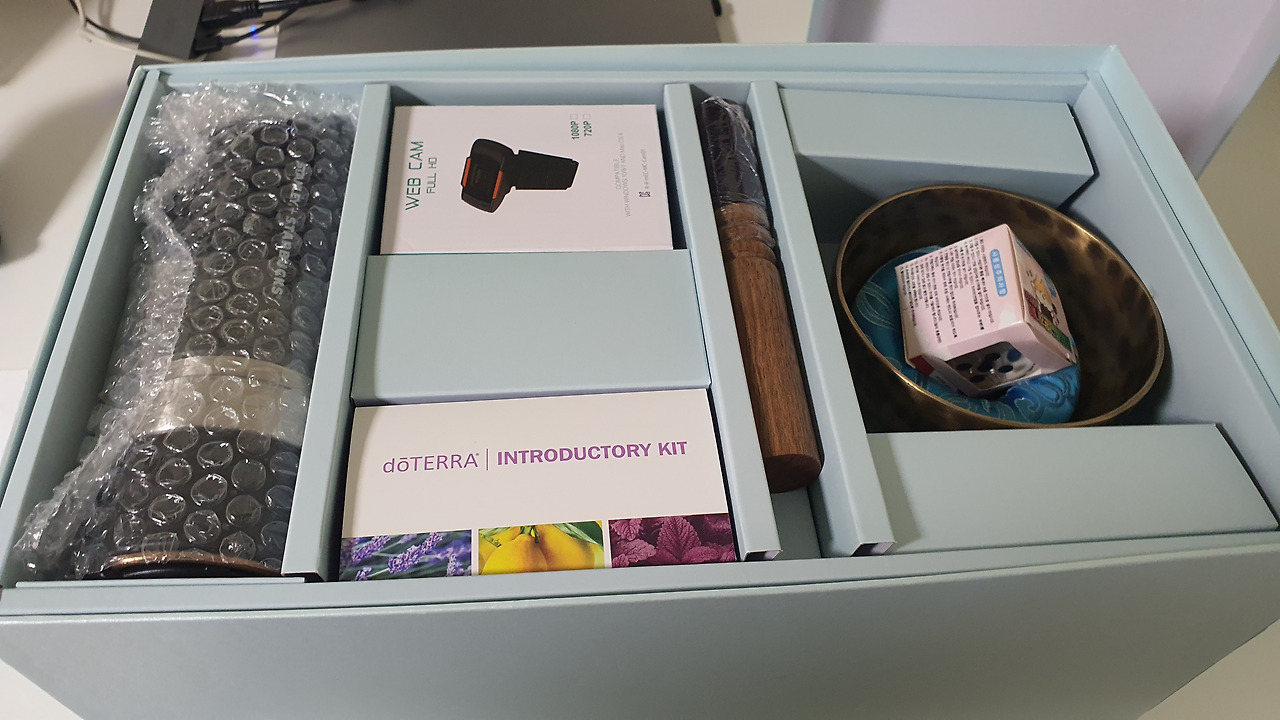 동해에서 요가를 하다가 친해진 요가 선생님이 웰니스 컬리지를 소개해주셨다. 참가자 모집 신청일만 손꼽아 기다리다가 6대 1의 경쟁률을 뚫고 운 좋게 참여하게 되었다. 요가와 명상, 싱잉볼 등 다양한 웰니스 프로그램을 경험하고 배울 수 있는 기회였다. 주말마다, 하루에 9시간씩 4주간 온라인 줌으로 다양한 수업을 들었다. 주위에서는 힘들지 않냐고 물었지만, 나에겐 일주일 중 가장 기다려지는, 무료한 일상의 유일한 숨구멍이었다. 그리고 국비지원으로 좋은 수업들을 들을 수 있다는 것만으로도 감사한데, 아낌없이 주는 나무처럼 이것저것 많이도 보내주셨다. 요가매트부터 수업에서 사용되는 부재료들이 커다란 박스에 담겨 선물처럼 도착했다. 차 명상에 필요한 오설록 차 세트와 텀블러, 도테라 아로마 오일, 먹기명상에 사용되는 견과류, 티베트 싱잉볼과 모래시계, 색채 명상에 쓰이는 48색 색연필과 도안 등이었다.