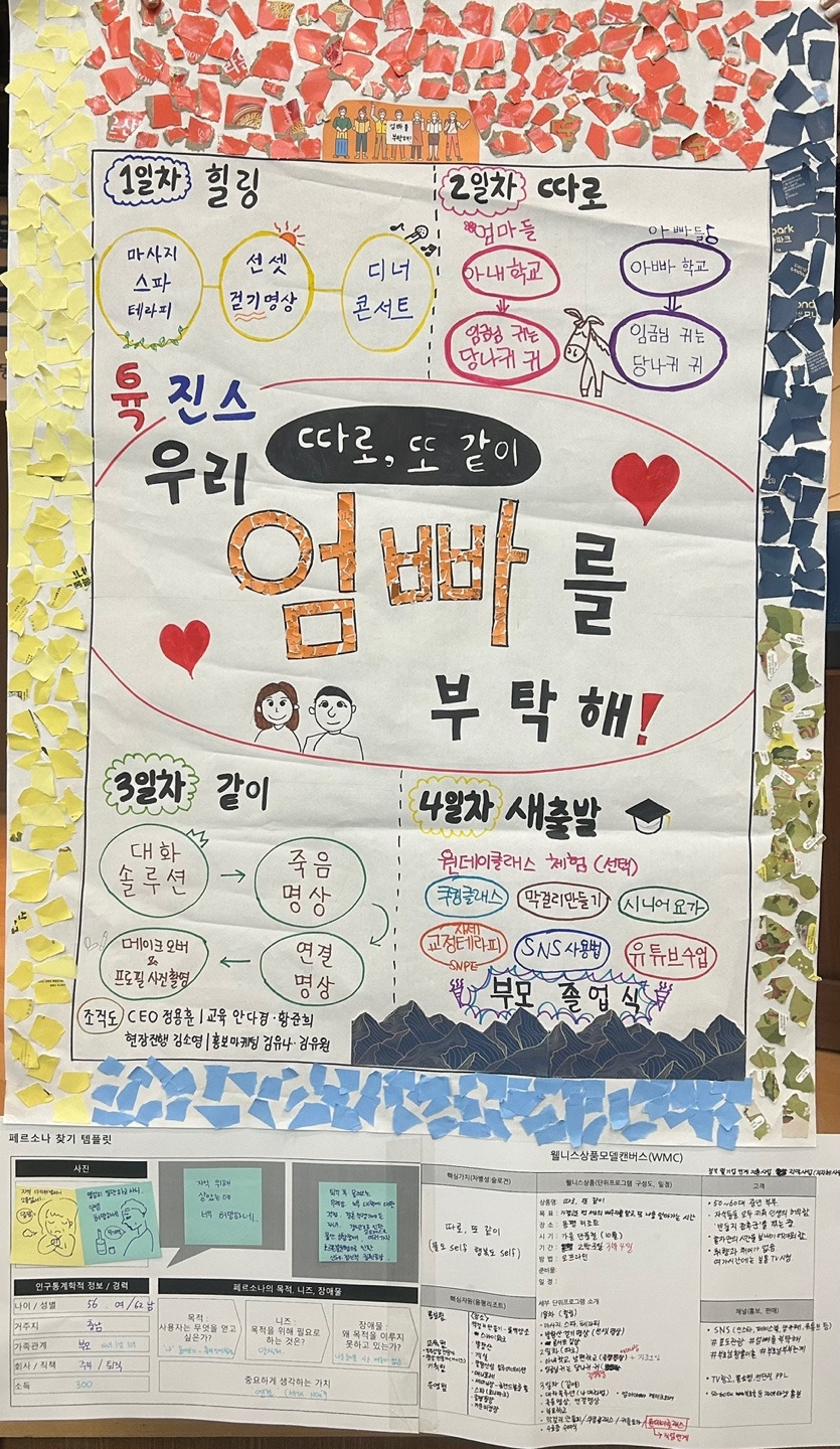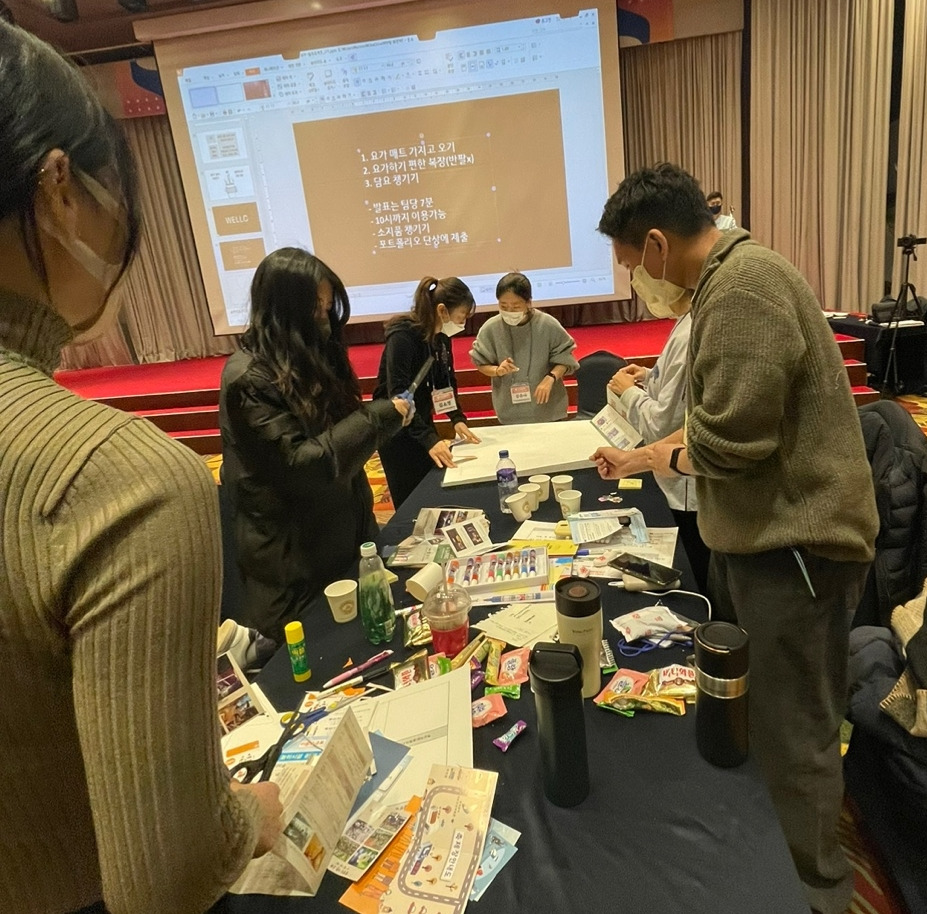 둘째 날에는 6명씩 팀이 되어 팀 프로젝트를 진행했다. 3박 4일간의 여정 중에 가장 즐거웠고, 가장 많은 깨달음을 얻은 시간이었다. 프로젝트는 개개인이 작성한 고객 페르소나를 랜덤으로 뽑아 웰니스 프로그램을 만드는 것이었다. 우리는 우리 부모님 세대인 5-60대 부부 고객을 위한 프로그램을 기획하게 되었다. 정말 운이 좋았다고 생각한다. 팀원들 모두가 공감하고, 이해하는 고객 대상이었기에 더 열심히 프로젝트에 임할 수 있었기 때문이다. 우리들의 부모님을 떠올리며, 진심으로 우리 부모님이 행복하기를, 이 프로그램에 참여함으로써 행복하고 의미 있는 경험을 하기를 간절히 바랐다. 여섯 명의 팀원들 모두 제각기 다른 삶을 살아왔지만, 우리 부모님 세대가 행복하기를 바라는 마음은 하나로 똘똘 뭉쳤다. 내 생에 이토록 아이디어가 쉴 새 없이 많이 나오고, 서로의 의견에 격하게 공감했던 조모임은 처음이었다.