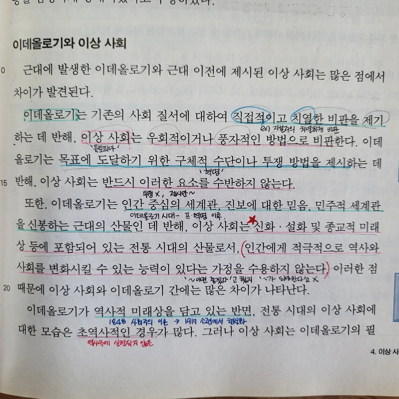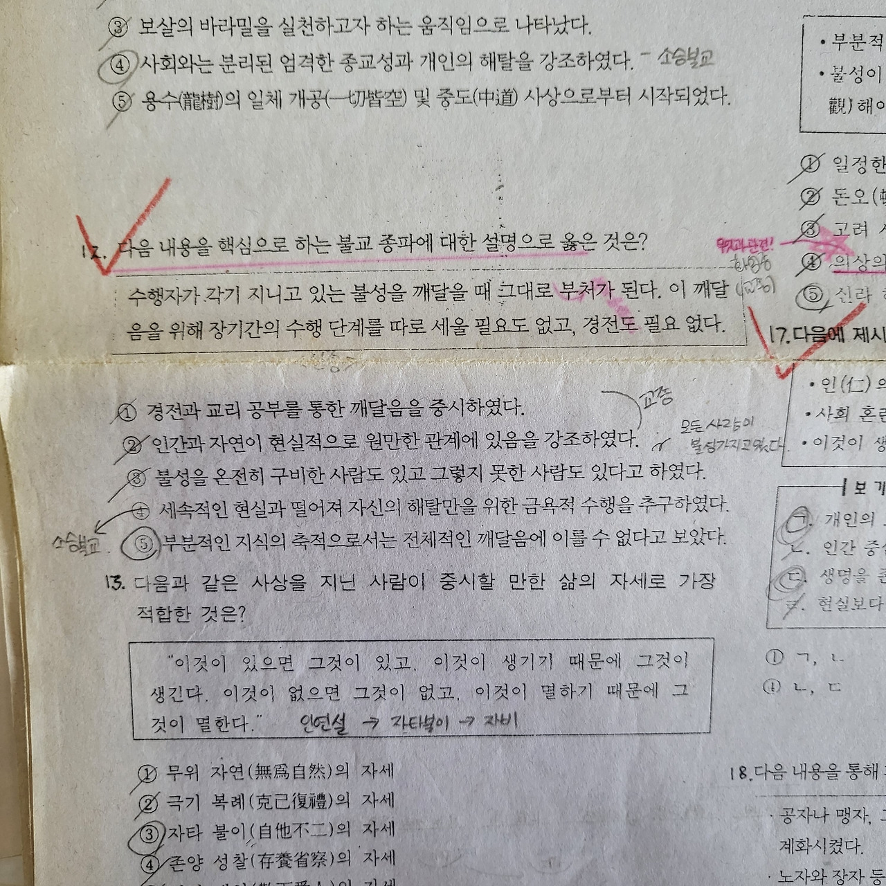 내 성적이 크게 향상되었던 계기 중 하나는 공부 잘하는 선배 얘기를 들었던 것이다. 중학교 때, 어떤 선생님께서 그 선배의 공부법 썰을 풀어주셨는데, 그 선배는 선생님들이 하는 농담까지도 책에 필기를 해둔다고 했다. 그때까지 나는, 선생님이 필기하라고 하는 부분만 필기를 하는, 아주 말 잘 듣는(?) 학생이었다. 그래서 지금 생각해보면 별 거 아닐 수 있는 조언이지만, 이것이 상당히 충격적으로 다가왔고 나에게 적용해봐야겠다고 결심했다. 결과는? 효과 만점. 우선 손을 계속 움직이니까 졸지 않고 수업에 더 몰입하게 되었다. 또, 선생님이 곁들인 예시 같은 걸 기록해두면 나중에 복습할 때 더 빨리 수업 내용이 상기되는 효과가 있었다. "중요하다"거나 "시험에 자주 나온다"라고 말씀하신 것은 특히 더 강조해서 표시해두었고, 그런 부분은 대부분 시험에 반영되었다(수업하는 사람이 곧 출제자이니 당연한 얘기ㅎㅎ).
