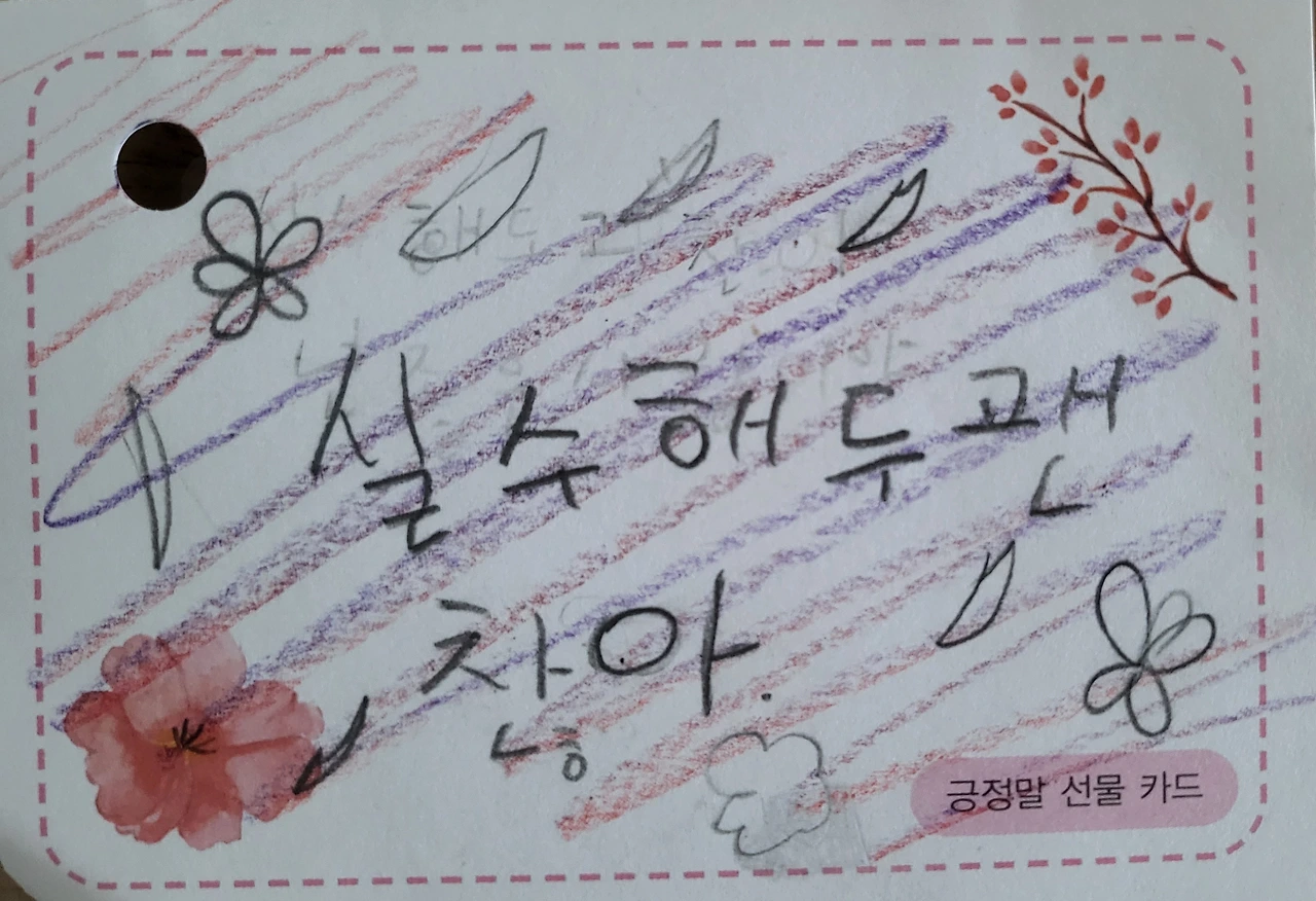 엄마한테 실컷 혼나고 나서야 정신이 들었다. 내가 우리 딸한테 무슨 말을 한 건지... 왜 이런 모습을 보였을까... 후회와 자책이 몰려왔다.나는 그날 잠자리에 들기 전에 금이에게 진심으로 사과했다. 금이는 나에게 "실수해두 괜찮아"라고 적힌 <긍정말 선물 카드>를 주며, 이렇게 말했다.