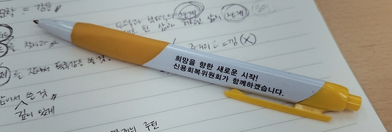 가장 놀라웠던 분은 나에게 볼펜을 빌려주신 분이셨다. 이 볼펜은 잉크가 잘 안 나와서 공책에 쓴다기보다 '새긴다'는 느낌으로 사용해야 했다. 그때 볼펜에 적힌 문구가 내 눈길을 끌었다.