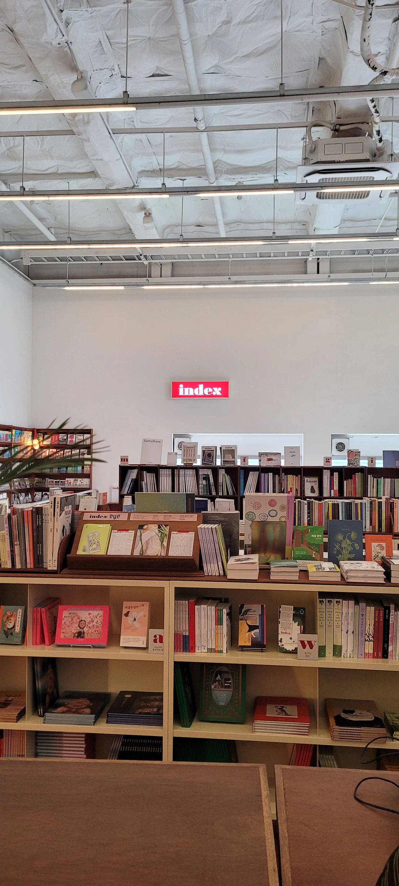 두 번째 간 곳은 건대 입구역의 <인덱스숍>이었지. 1970년대 공장을 리모델링해서 그런지 서점을 가는 길도 참 독특했어. 직접 제작한 깔끔한 문구류들과 포스터, 수제 캐러멜을 판매하는 게 이색적이었고 분야별로 하얀 선반에 채워져 있는 책들이 너무 사랑스럽게 보였어. 큐레이션 된 책들 중 내 호기심을 끈 책도 찾아서 심장이 두근거렸어. 베스트셀러도 아니고 자주 광고를 해 눈에 익숙했던 책도 아닌데 생각지도 못한 낯선 책에 마음을 빼앗길 수 있다는 경험은 언제나 반갑고 설레더라. 이번에도 그런 책을 만나 얼마나 기분이 좋던지. 네가 사준 음료수를 마시면서 서점의 분위기, 흐르던 음악, 창가에서 내리는 햇살, 사장님의 따스한 미소에 온몸의 긴장감이 싹 녹아내리던 그날, 그 시간을 잊을 수 없을 것 같아. 멋진 곳 데려가 줘서 고마워.