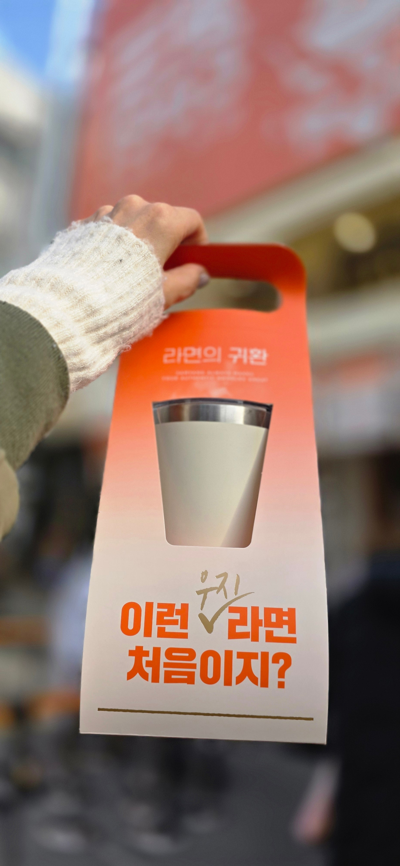 바람이 쌩쌩 불어 손과 코가 시릴 정도로 꽤나 추운 날씨였지만 줄은 줄어들지 않고 우리의 대기번호도 줄어들 줄 몰랐다. 결국 3시간이 지나서야 텀블러에 담긴 라면 세 젓가락을 겨우 먹을 수 있었다는 눈물겨운 사연 등장! 그런데 그게 중요한 게 아니라, 마땅히 라면을 먹을 만한 곳이 없어 팝업 매장 건너편에 있는 대형 건물 1층 로비 앞의 벤치에 앉아 시린 손을 덜덜 떨며 뜨거운 김이 모락모락 나는 라면을 호호 불어 먹었는데 세상에 이런 꿀맛이. 누가 보면 라면 처음 먹는 사람처럼 감탄하며 연신 맛있다, 너무 맛있다를 외쳤다. 캠핑장에 와서 먹는 라면 느낌도 나고, 매콤하면서도 진한 소고기 육수의 맛이 느껴지는 추억의 라면을 먹으니 이곳이 천국인가 싶었다. 맨날 먹는 라면이 뭐 그리도 맛있냐고 할 수 있지만, 밖에서 먹는 라면이어서 그랬는지, 날씨가 추운데 텅텅 비어있던 속을 뜨끈하게 데워주던 국물이 맛있어서 그랬는지, 여러 사람들에 둘러싸여 함께 먹으니 동지애가 느껴져 든든했던 건지, 뭔지는 모르겠지만 마치 내가 성수동에 캠핑을 나온 듯 들뜬 기분이 들어 정말 신기했다.