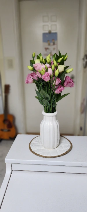 화병은 저희 집 거실 전자피아노 위에 올려져 있답니다. 왜냐하면 거실은 항상 신랑이 휴대폰 보면서 누워있는 소파가 있고, 딸이 강아지와 장난치며 놀거나 책을 읽고 티브이를 보는곳이라 우리 가족들의 아지트이기에 당첨이 되었지요.