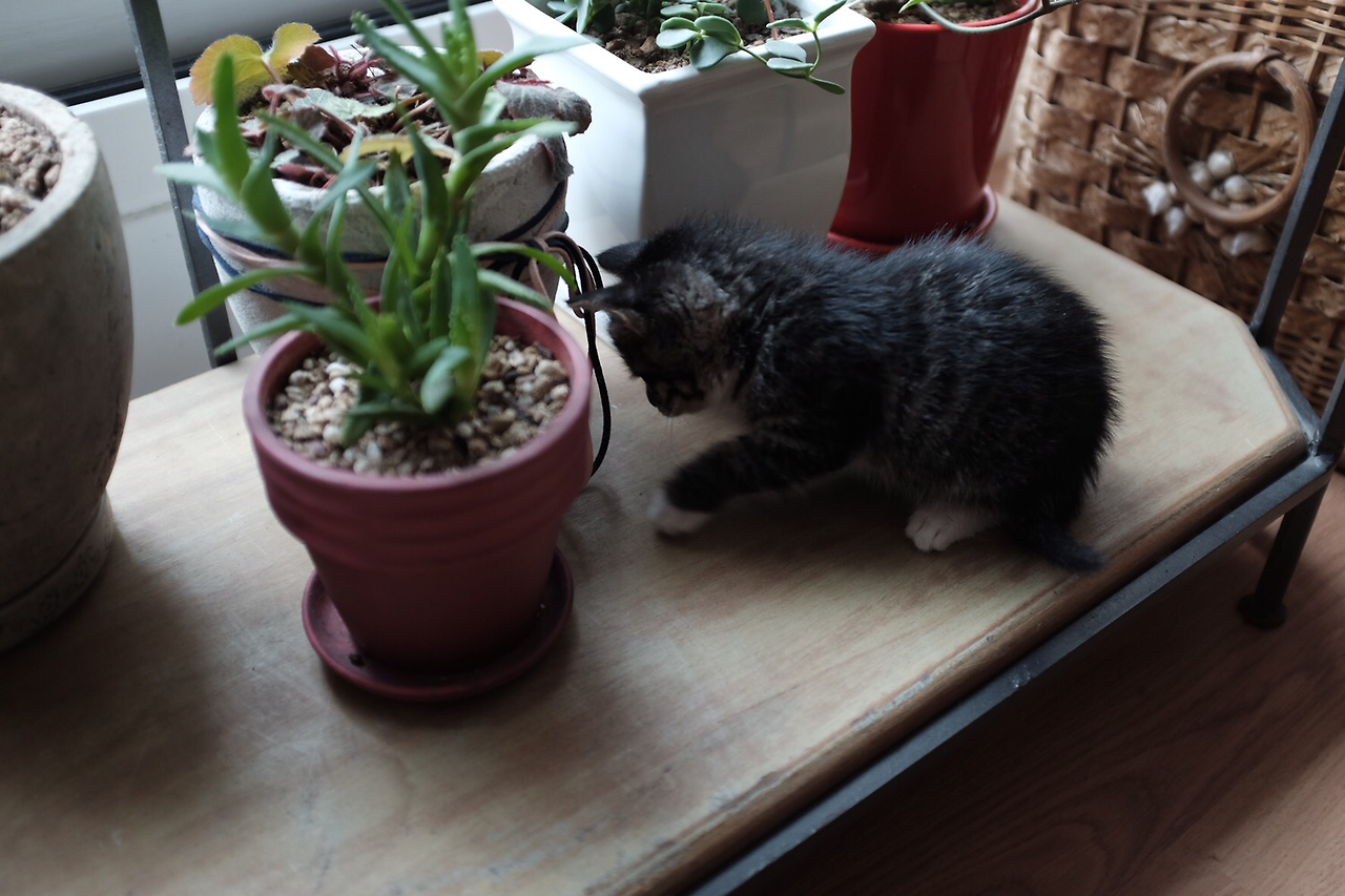 여기저기 겁과 호기심을 함께 지니고 돌아다니던 뚜이의 활동 반경이 넓어졌다. 높은 곳에 올려놓기라도 하면 떨어질까 봐 졸졸 따라다니고, 놀다가 어디 부딪힐까 봐 한시도 눈을 떼지 못했는데 어느새 침대 위에 폴짝 올라오고, 높은 탁자 위에 올라서서 망설임 없이 뛰어내린다. 건드리지 못 하게 높은 곳에 올려놨던 물건들은 벌써 위협을 받고 있다. 소용이 없어진 거다. 화분들이 바닥에 있다가 선반 위로 올라갔다. 하지만 그들도 머지않은 것 같다. 단체로 곧 이사를 가야 할지도.