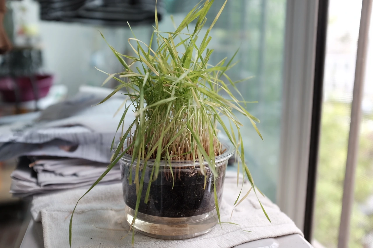 네 번째 캣그라스였다. 첫 번째 캣잎은 뚜이가 무서워해서 버렸고, 두 번째 캣그라스는 뚜이가 너무 좋아해서 잘 키워보려 했는데 곰팡이가 조금씩 생기기 시작하더니 날파리들까지 꼬여 버렸고, 세 번째 캣그라스는 궁디팡팡 박람회에 가서 큰맘 먹고 큰 화분으로 사 왔는데 갈색 잎들이 순식간에 번지면서 역시나 날파리들이 꼬여 들더니 죽어버렸다.