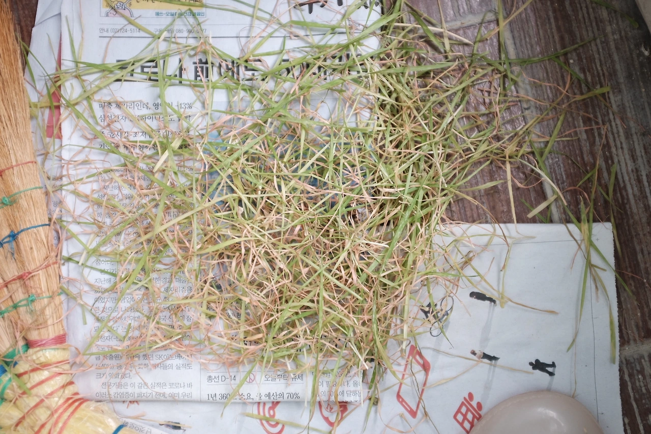 지금 보니 너무 빽빽하게 잎이 들어차 바람도 제대로 통하지 않았을 것 같았다. 곰팡이가 생긴 이유도 그 때문이겠지. 많은 잎을 잘라냈다. 무지하고 욕심 많은 주인 때문에 고통받는 건 이 여린 식물이었다. 발밑에 잘린 잎들이 수북하게 쌓였다. 화분 속의 캣그라스는 반으로 줄어 휑했다. 어떻게 보면 흉하기도 했다. 한참을 잘라내고 보니 한 시간이 훌쩍 지나갔다. 뒤에는 자는 줄만 알았던 뚜이가 나를 지켜보고 있었다.