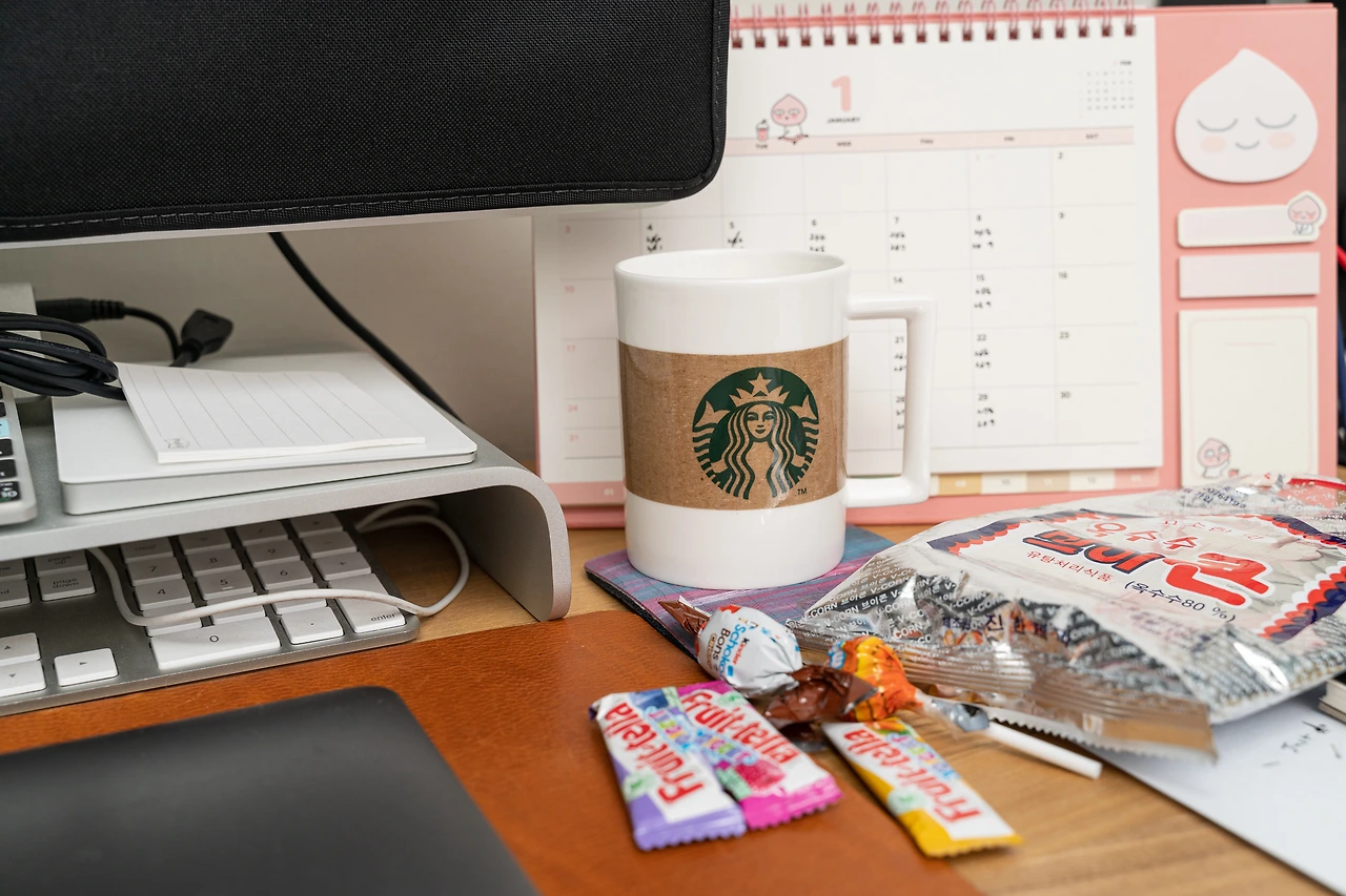 책상에서 노트북과 안경만큼 중요한 업무 필수품, 간식. 요즘은 초등학교 때 사 먹던 브이콘에 푹 빠져서 한 박스나 샀다. 가끔은 내가 일을 하기 위해 간식을 먹는 건지 간식을 먹기 위해 일을 하는 건지