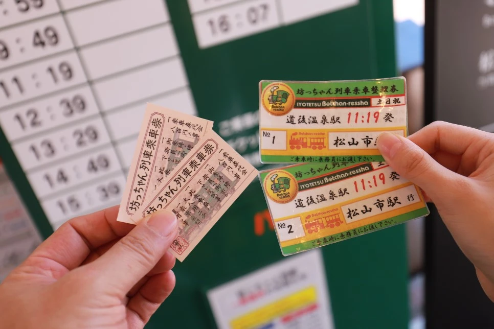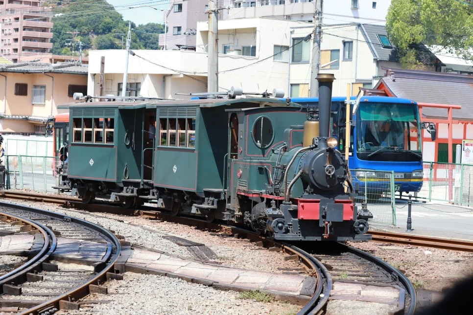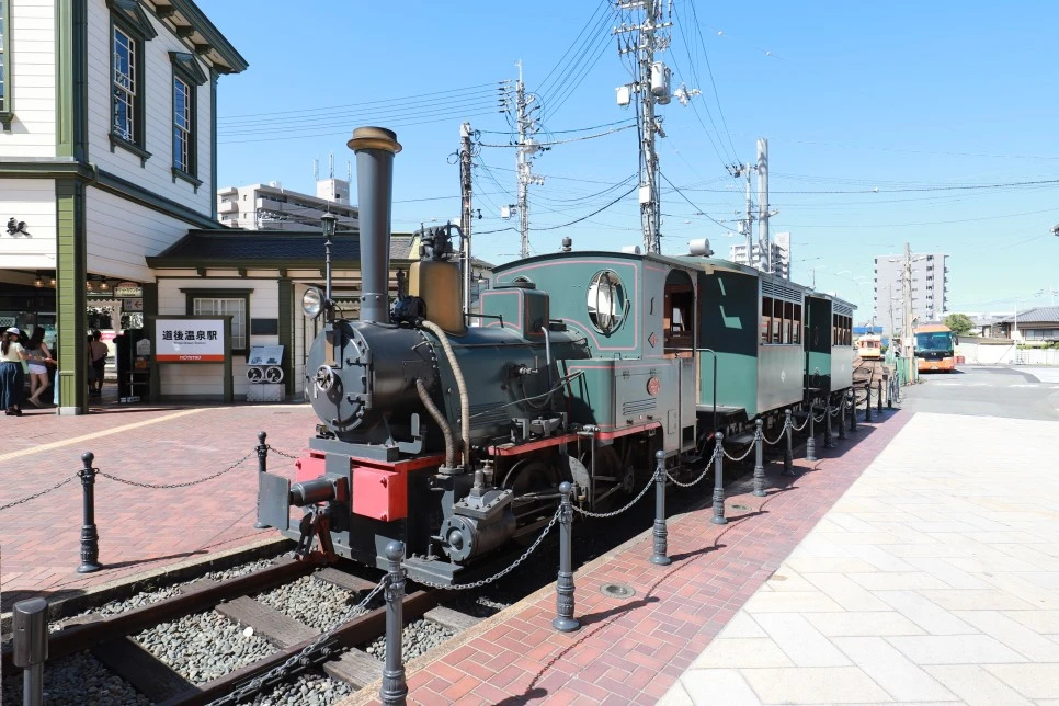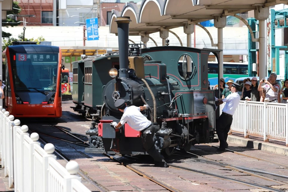 시간이 되어 봇쨩 열차를 타러 갔다. 여름엔 정말 비추인 봇쨩(坊ちゃん) 열차^^^^* 내부에 냉방 시설이 없다. 그럼에도 소설 <도련님>의 주인공이 매일같이 온천을 하러 왔다 갔다 하던 열차를 그대로 재현해 놓았기 때문에, 소설을 읽은 사람이라면 상사하던 장면을 체험할 수 있어 좋다. 다만 옛 모습 그대로 보존을 해 놓은 열차라 별도의 냉방 시설이 없고, 환경을 생각해 연료만 바꿨다고 들었다. 타고 있는 내내 승무원이 이곳저곳 설명해주고 사진도 찍어준다.