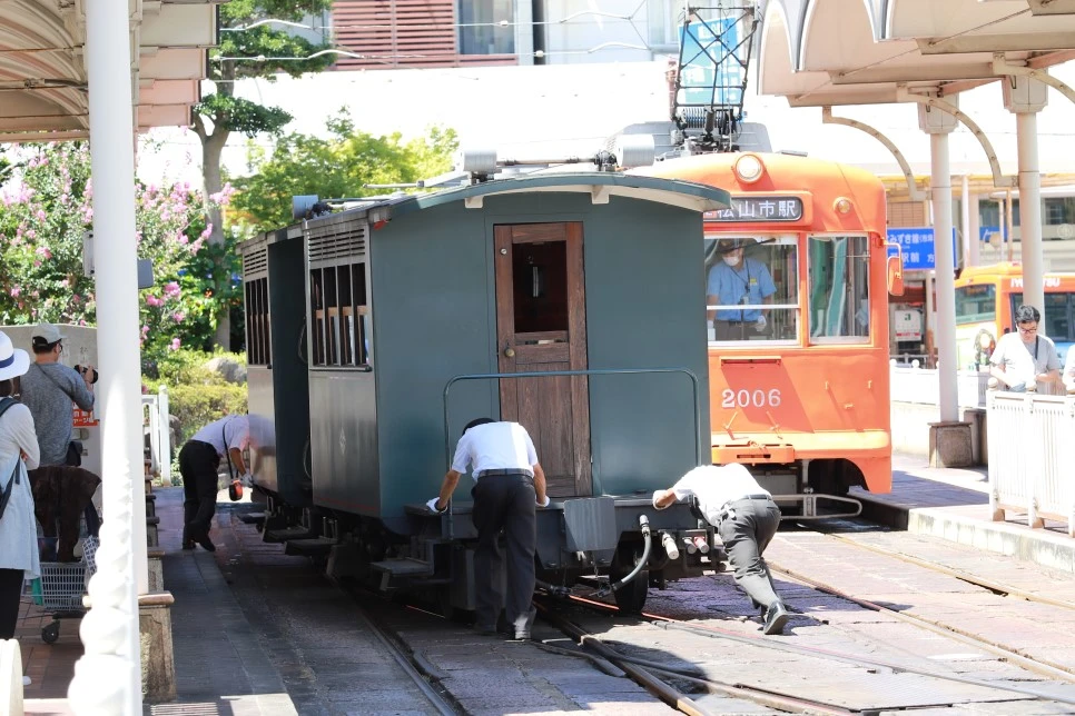 종점인 마츠야마시역에 도착하고 신기했던 것은 모든 것이 수동인 봇쨩 열차. 운전과 안내를 담당하던 승무원이 내려 열차를 밀고 선로를 바꿔 앞뒤를 돌렸다.