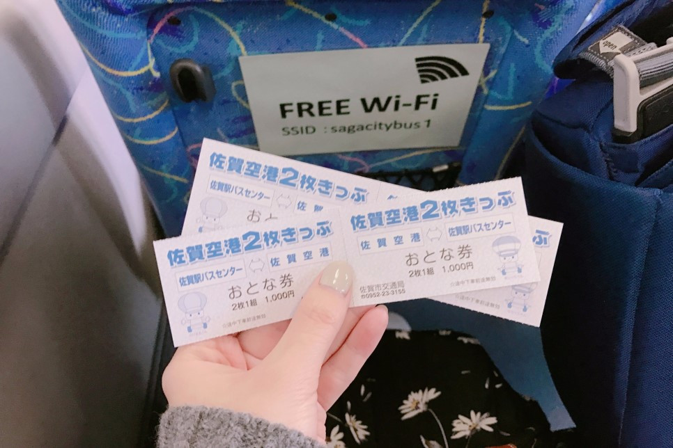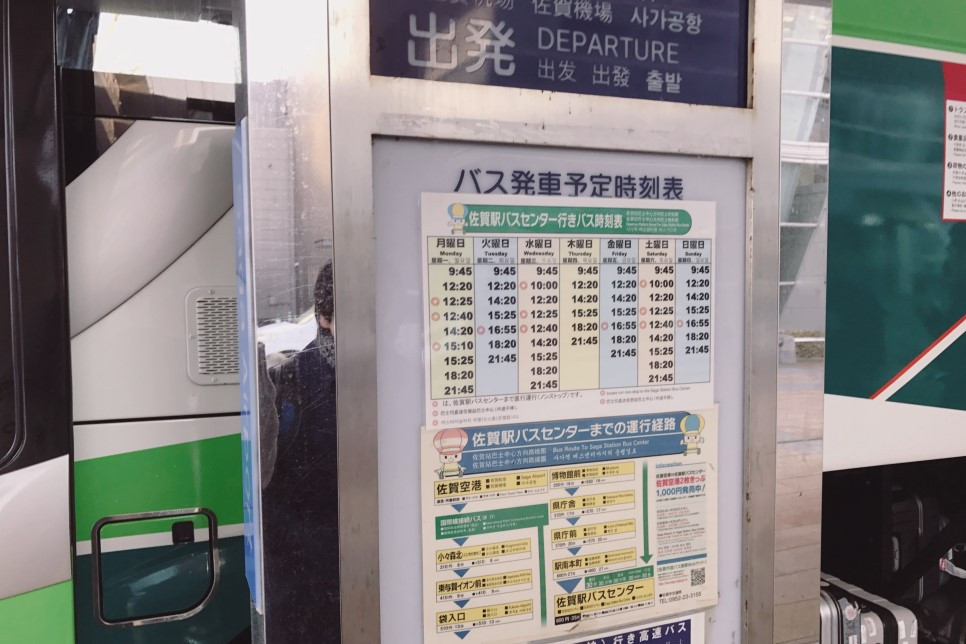 공항에서 나가면 바로 초록색 공항버스를 볼 수 있다. 버스 앞에는 마치 암표를 파는 듯한 아주머니가 가방을 메고 서 계시는데, 공항버스 표를 파는 분이다. 당황하지 말고 그분께 왕복 티켓을 구입하면 된다. 편도는 1인당 600엔, 왕복은 1000엔이기 때문에 사가에서 여정을 시작하고 끝낸다면 왕복 티켓 구매가 더 이득이다.
