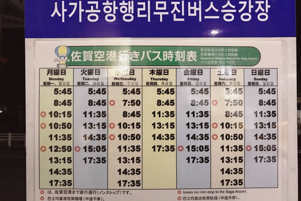 다시 공항으로 돌아가는 버스는 사가역 바로 옆에 위치한 버스센터의 1번 승차구에서 타면 된다. 공항버스 시간표는 위와 같다. 시간 옆에 빨간 동그라미가 붙은 것은 사가역에서 공항까지 논스톱으로 운행된다. 대부분의 티웨이 승객이 이용하기 때문에 사람이 많은 편이다. 사가역에 올 때처럼 서서가는 승객은 없었던 것 같으나, 모두들 처음 도착한 날 버스가 매우 복잡하다는 것을 아는지 출발 시간이 멀었는데도 승차구 앞에 줄을 길게 섰다.