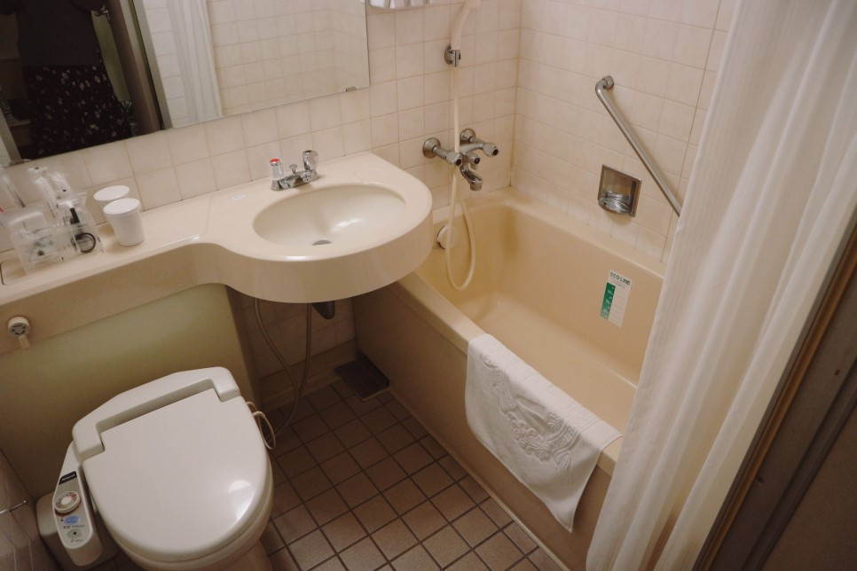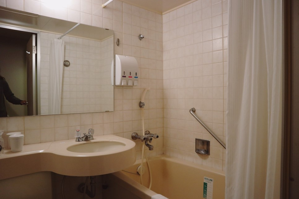 화장실도 일본 비즈니스호텔에서 자주 보던 구조이다. 다만 세면대의 온수/냉수꼭지가 나뉘어져 있다. 어매니티는 벽에 부착된 상태로 바디클렌져와 샴푸, 린스가 있다. 비누 역시 따로 준비되어 있지 않다.