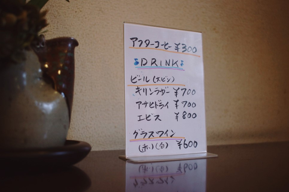 맥주와 와인도 판다. 큰 병으로 파는 맥주가 있는데, 기린 라거(700엔), 아사히 드라이(700엔), 에비스(800엔) 세종류가 있다. 와인은 화이트와 레드 와인을 글라스로 파는데, 잔당 600엔이다.